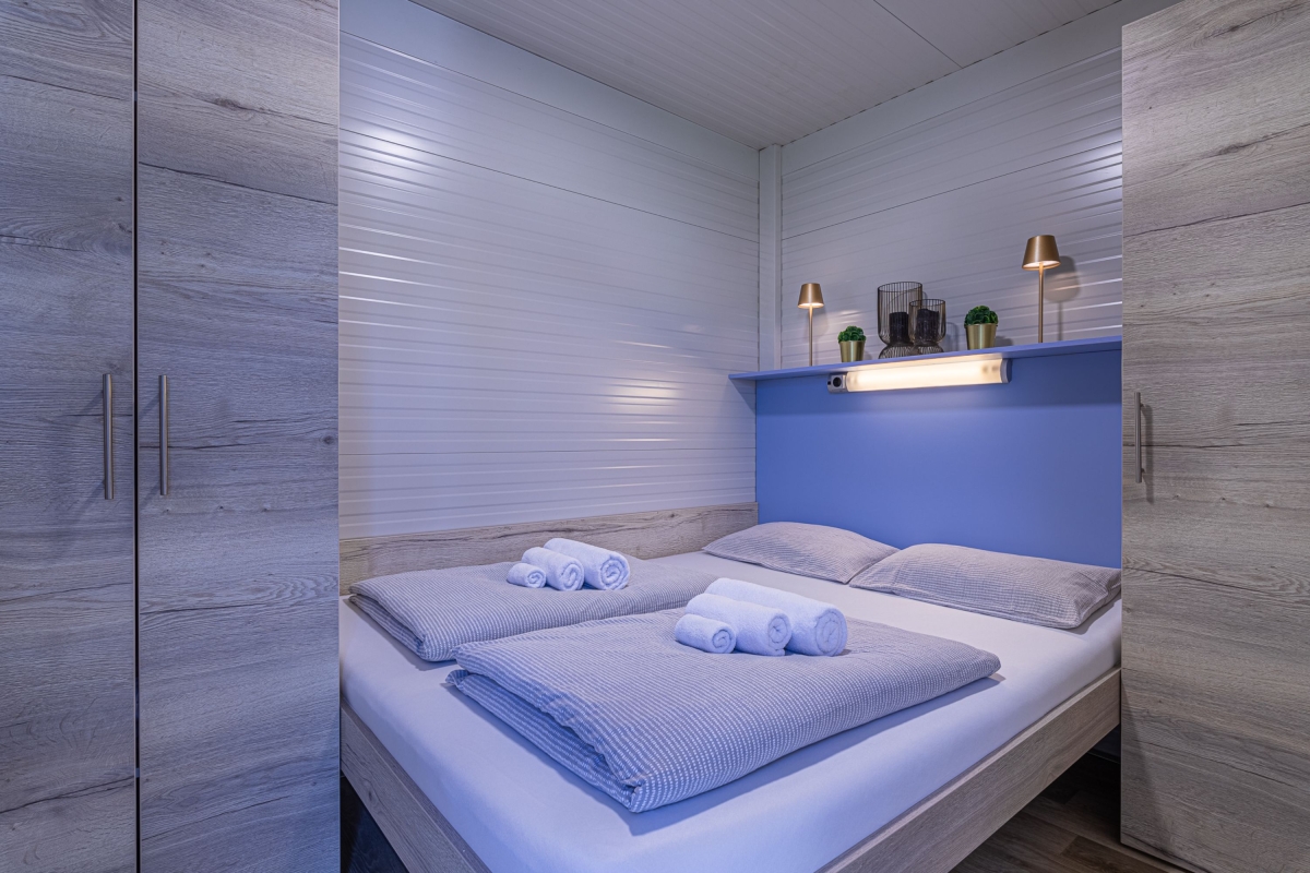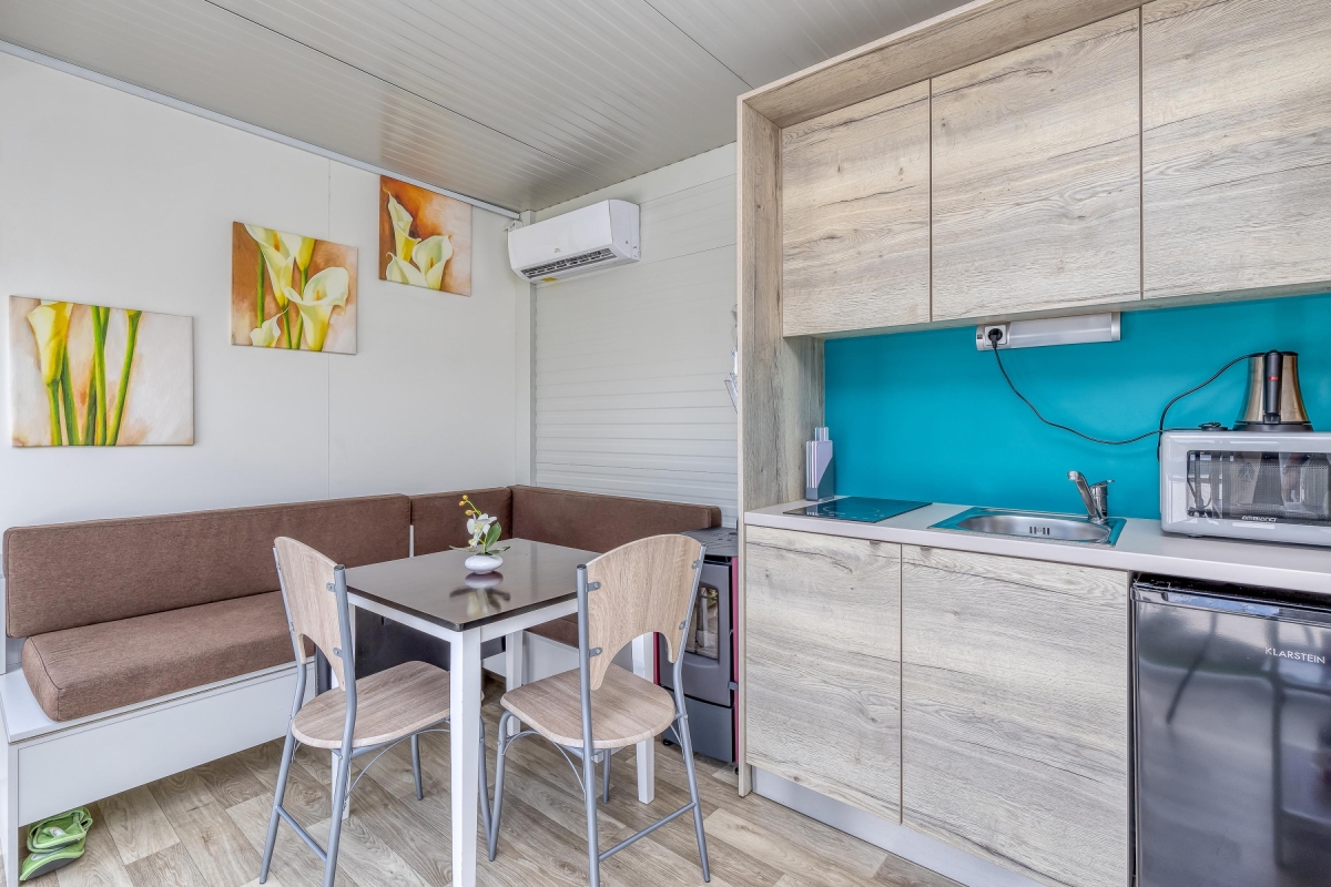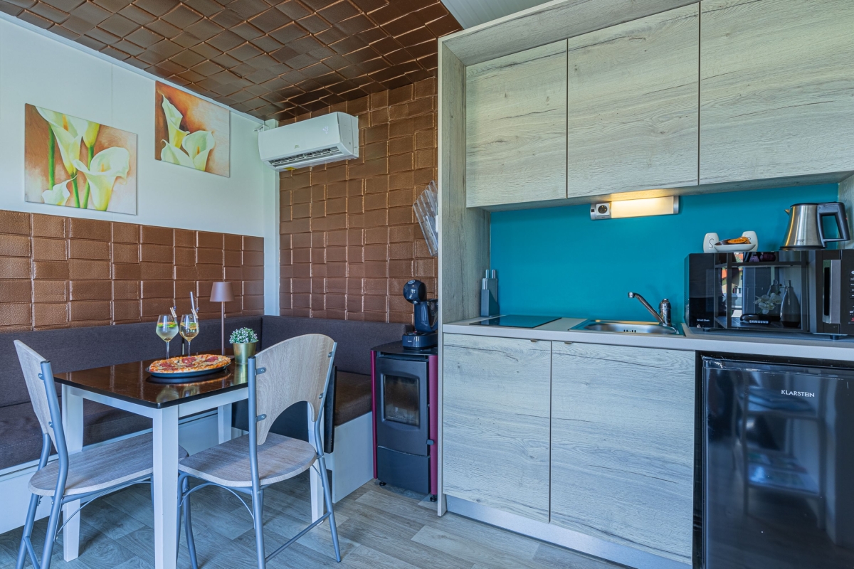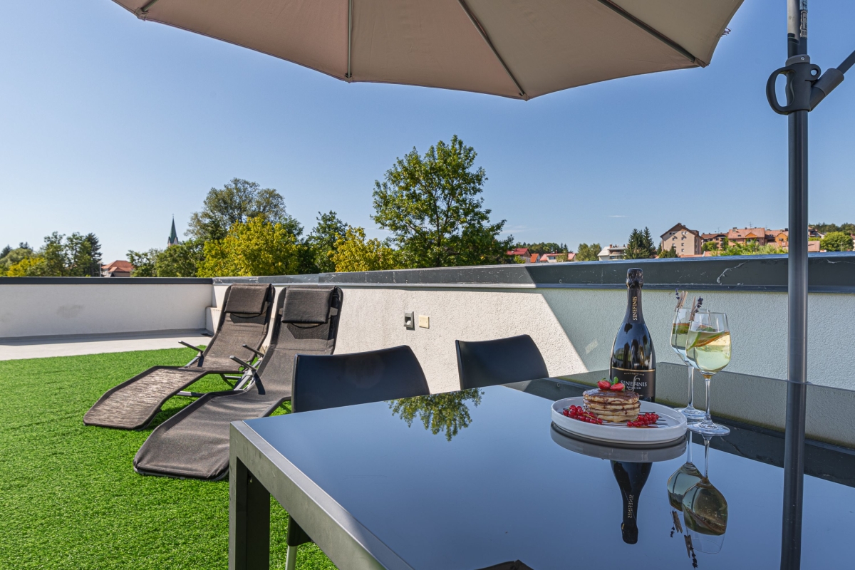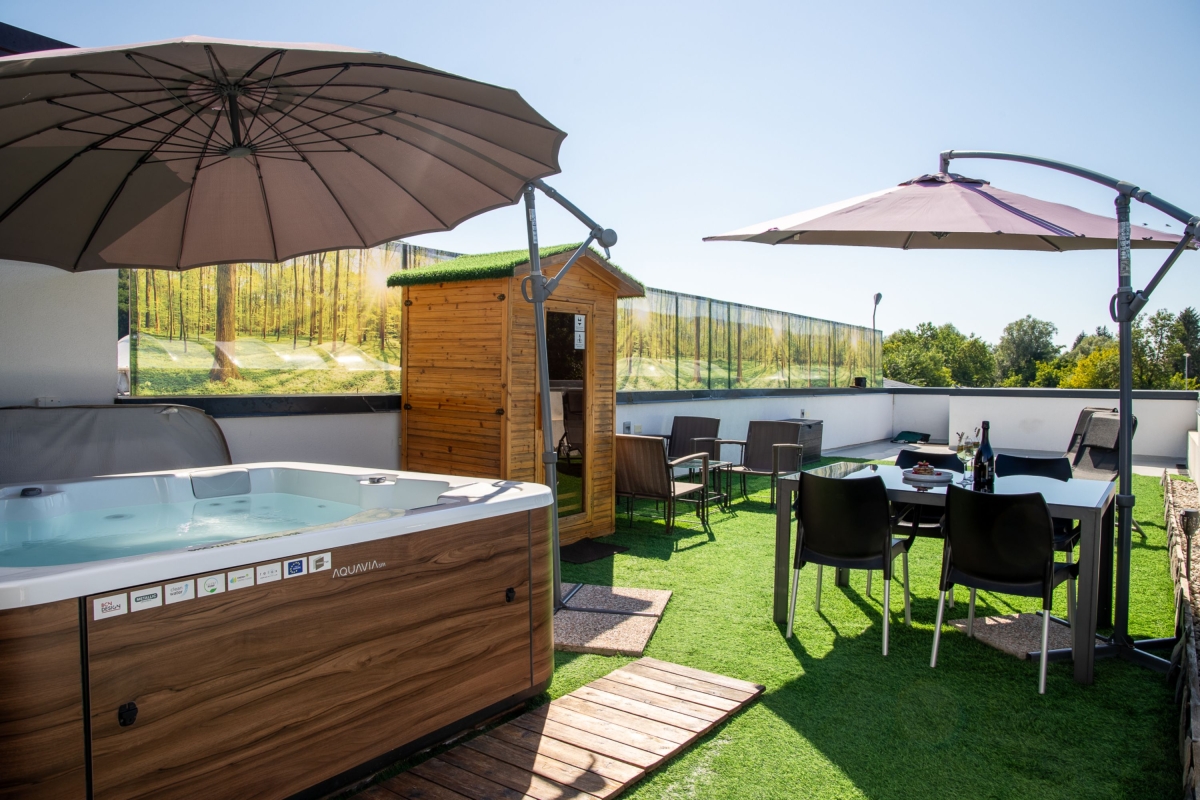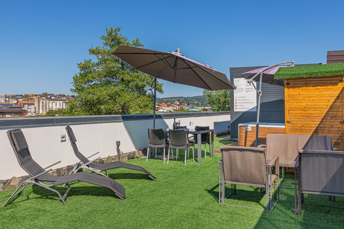 Quietly situated on a rooftop, this contemporary mobile home is surrounded by a spacious, private sun terrace furnished with a large jacuzzi, an infrared sauna, two loungers and an outside dining table and chairs. From here guests can enjoy views of the city, the surrounding meadows and the nearby river Temenica.