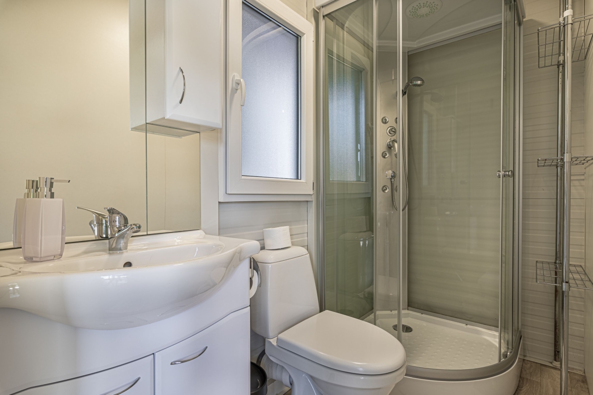 Bathroom: The bathroom is fitted with a shower, a washbasin and a WC