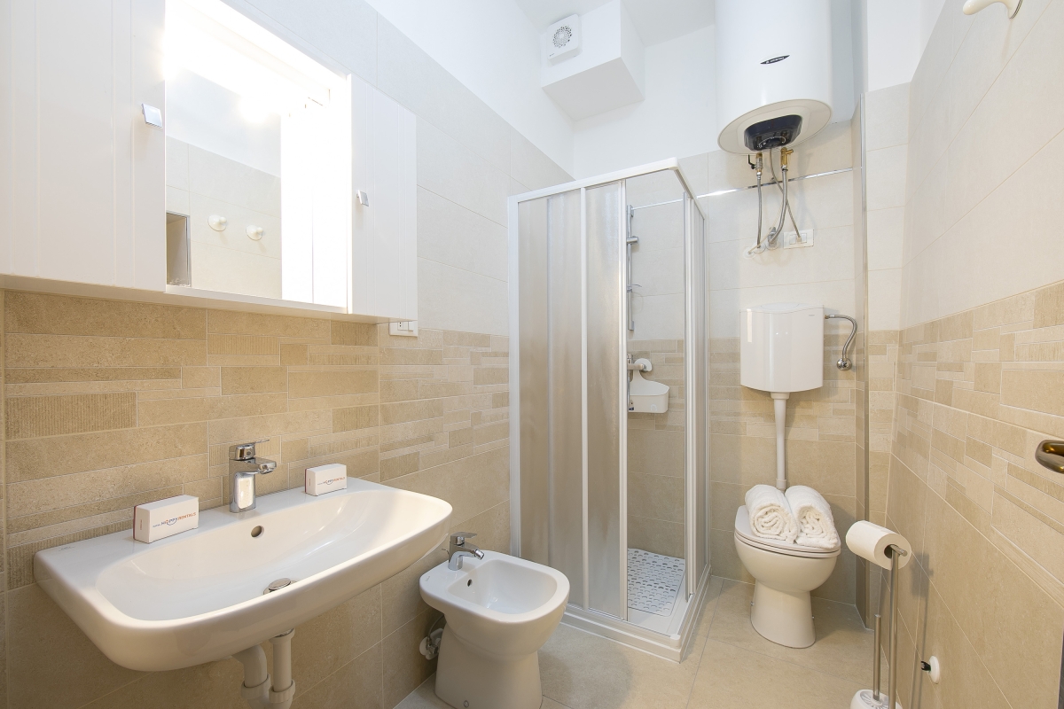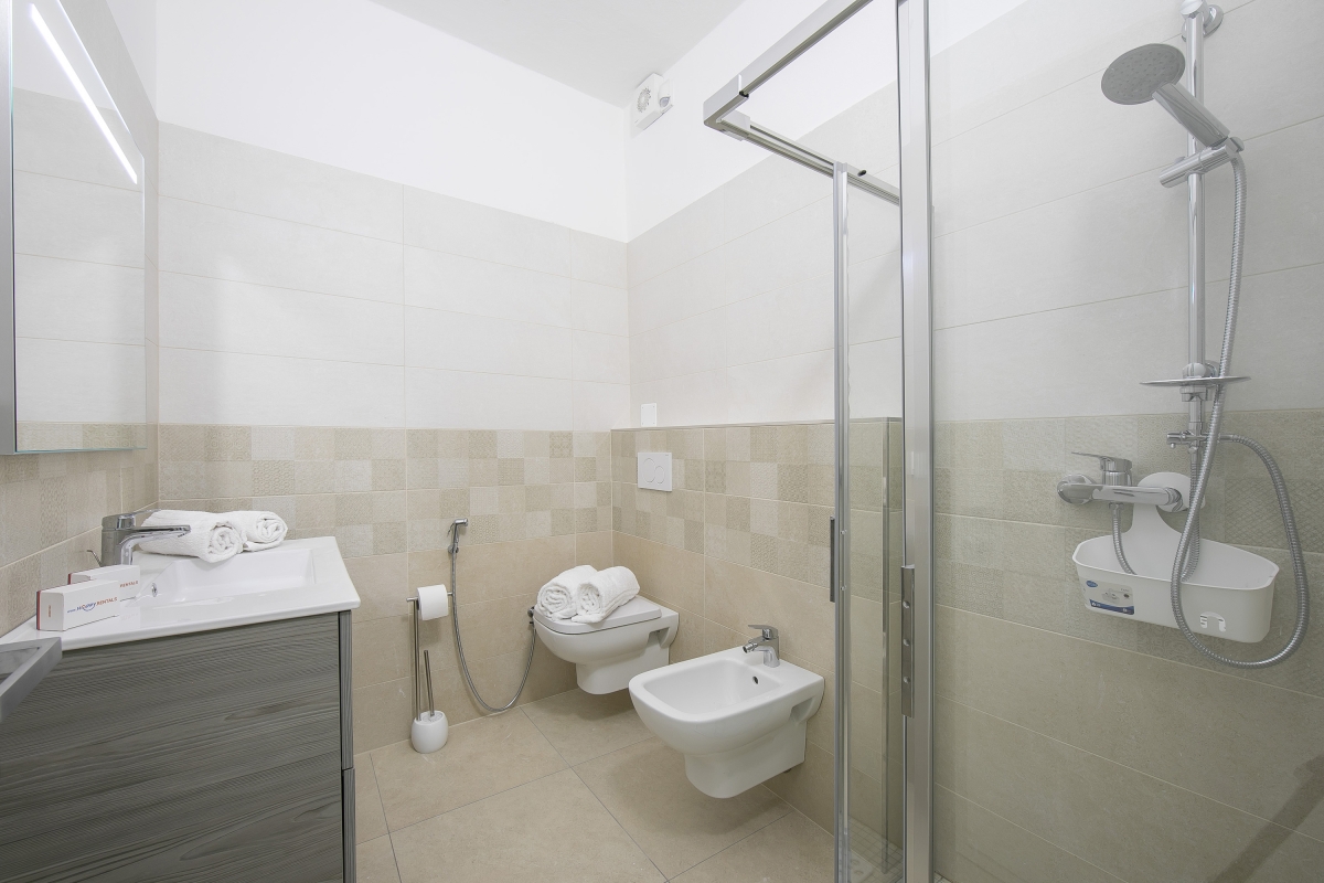 Bathroom 1: A luminous full bathroom with a walk-in shower, WC, sink and bidet.