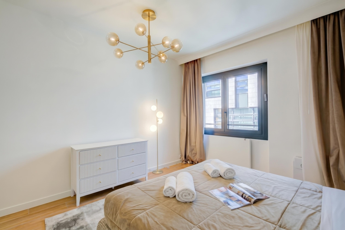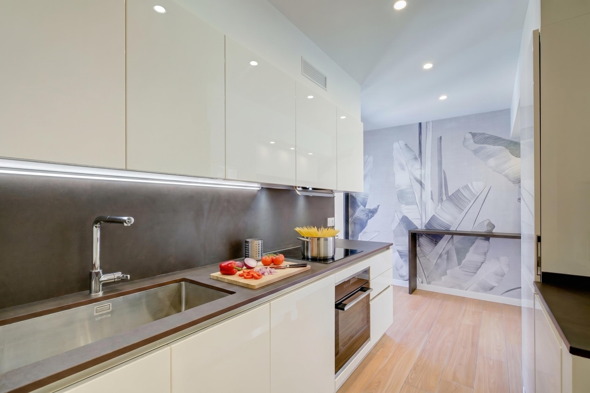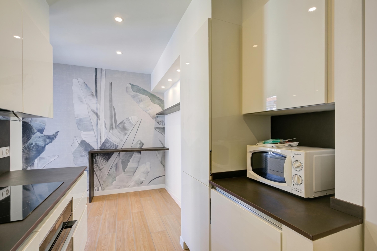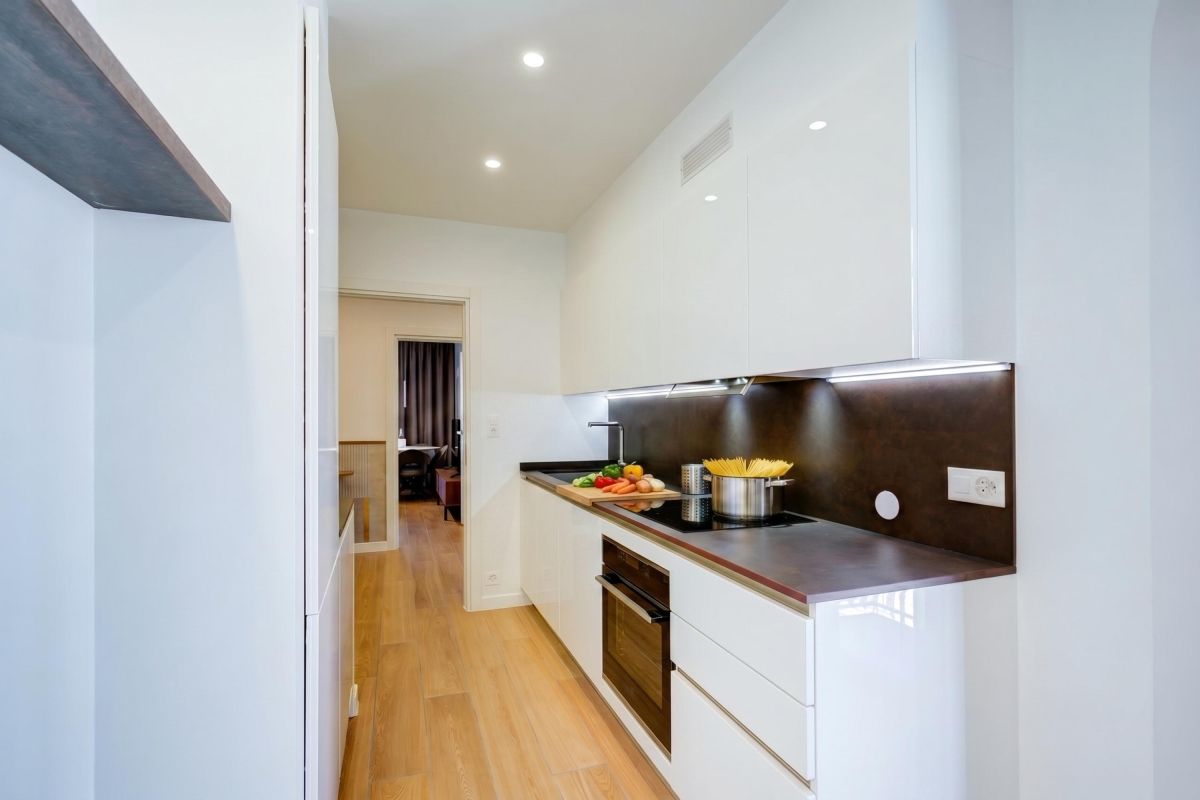 The spacious, modern kitchen has a breakfast bar next to the large glass door that leads out onto another little balcony. It is equipped with everything you might need for your stay: an induction hob, oven, microwave, dishwasher, washing machine, fridge, freezer and a Nespresso machine.