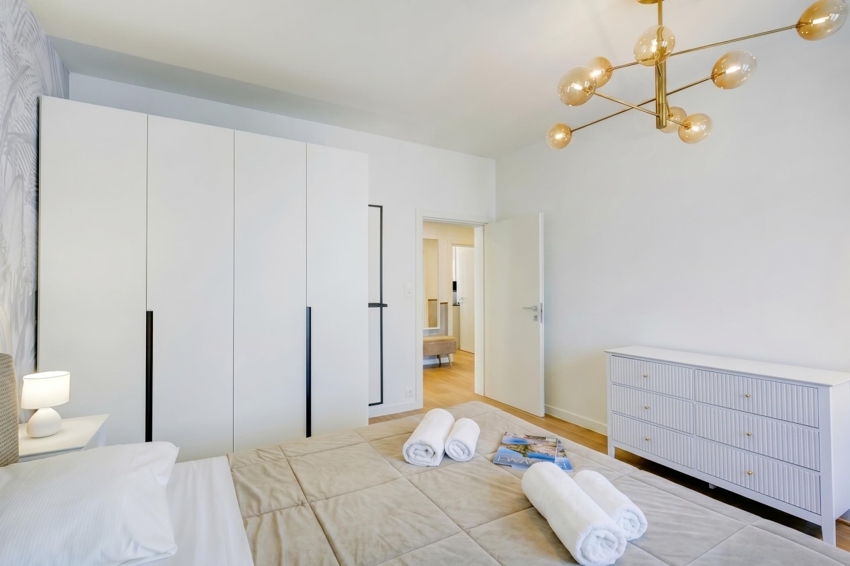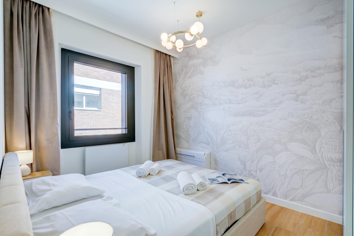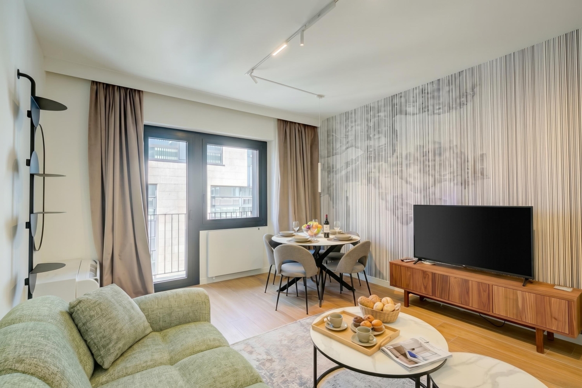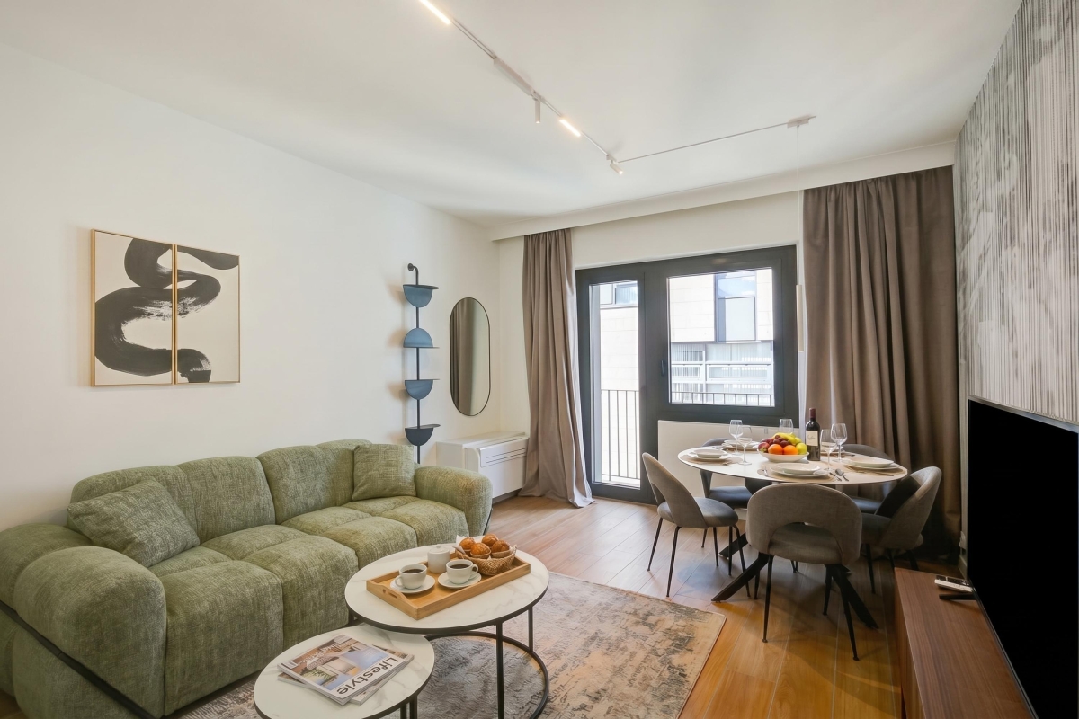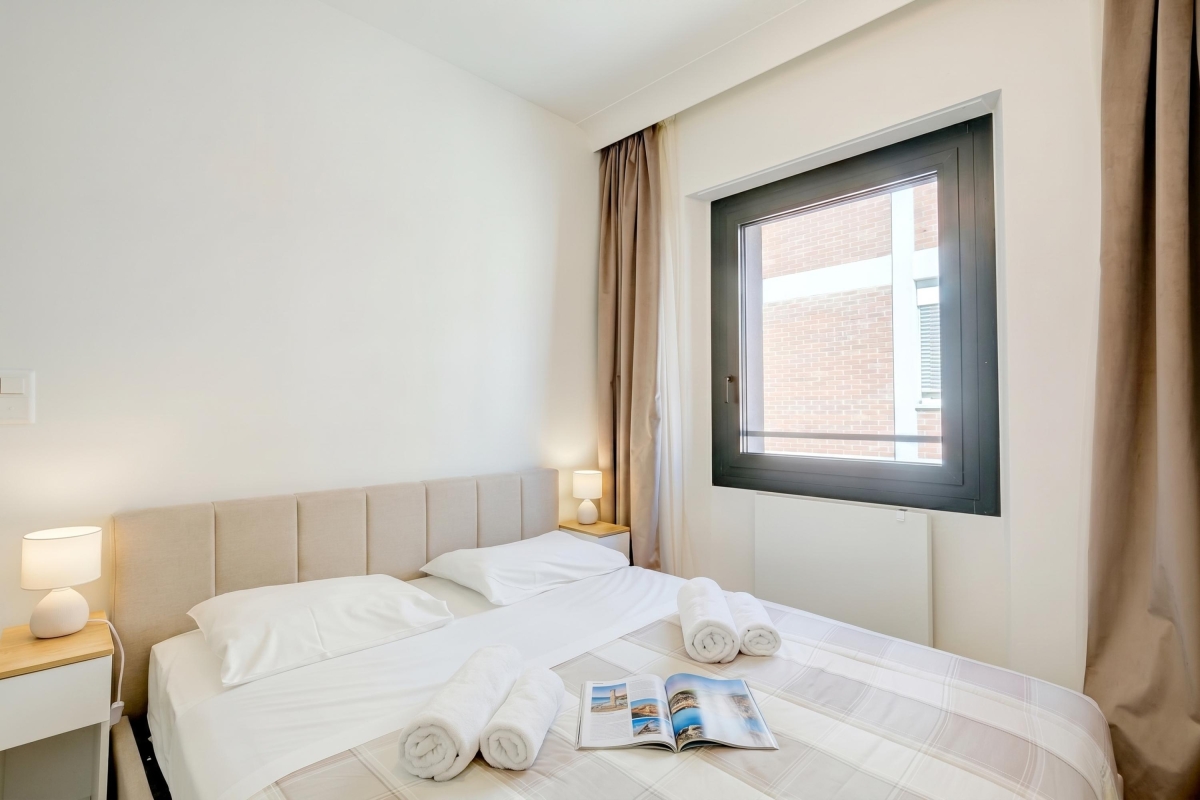 On the fourth floor (with lift) of a recent development, this 2-bedroom flat sleeps 6 people. The airy living room has a large window and a glass door, leading onto a balcony overlooking the street. There is a large sofa (which converts into a double bed), a Smart TV and a contemporary dining table with 6 chairs. There is plenty of space for people to relax with friends or work in comfort.