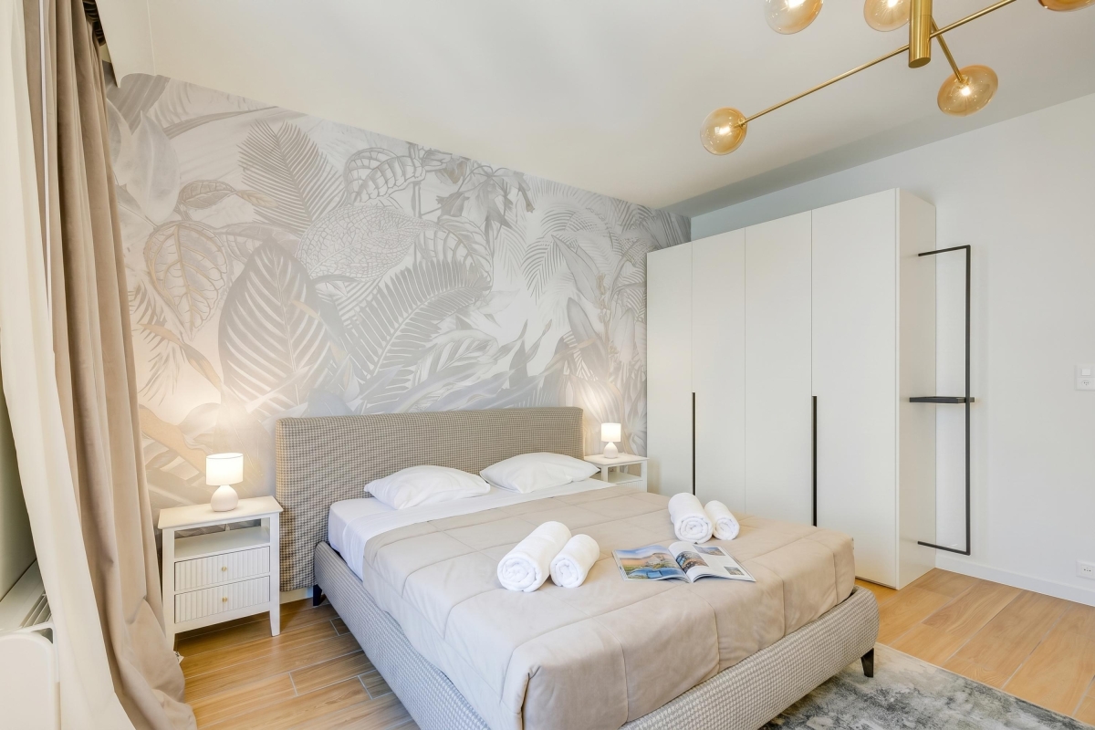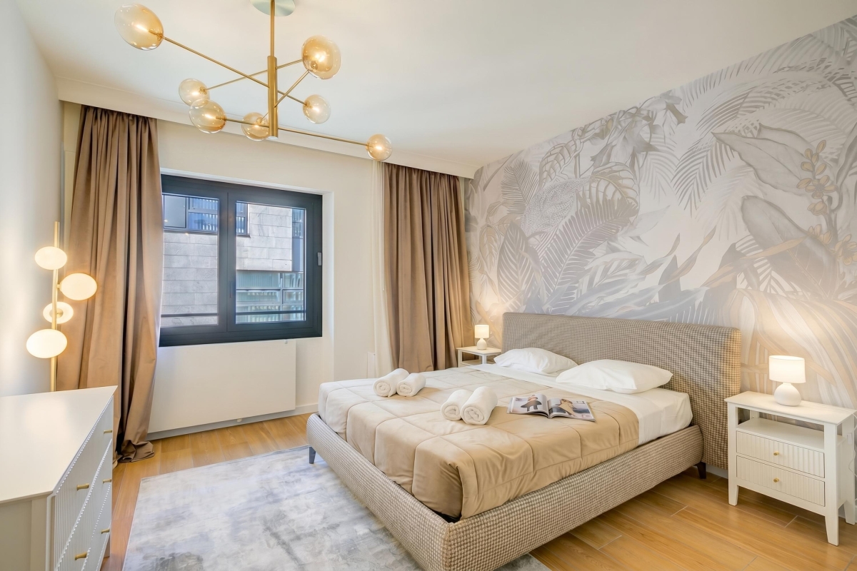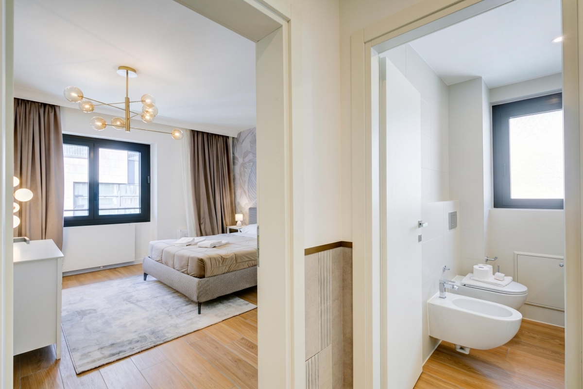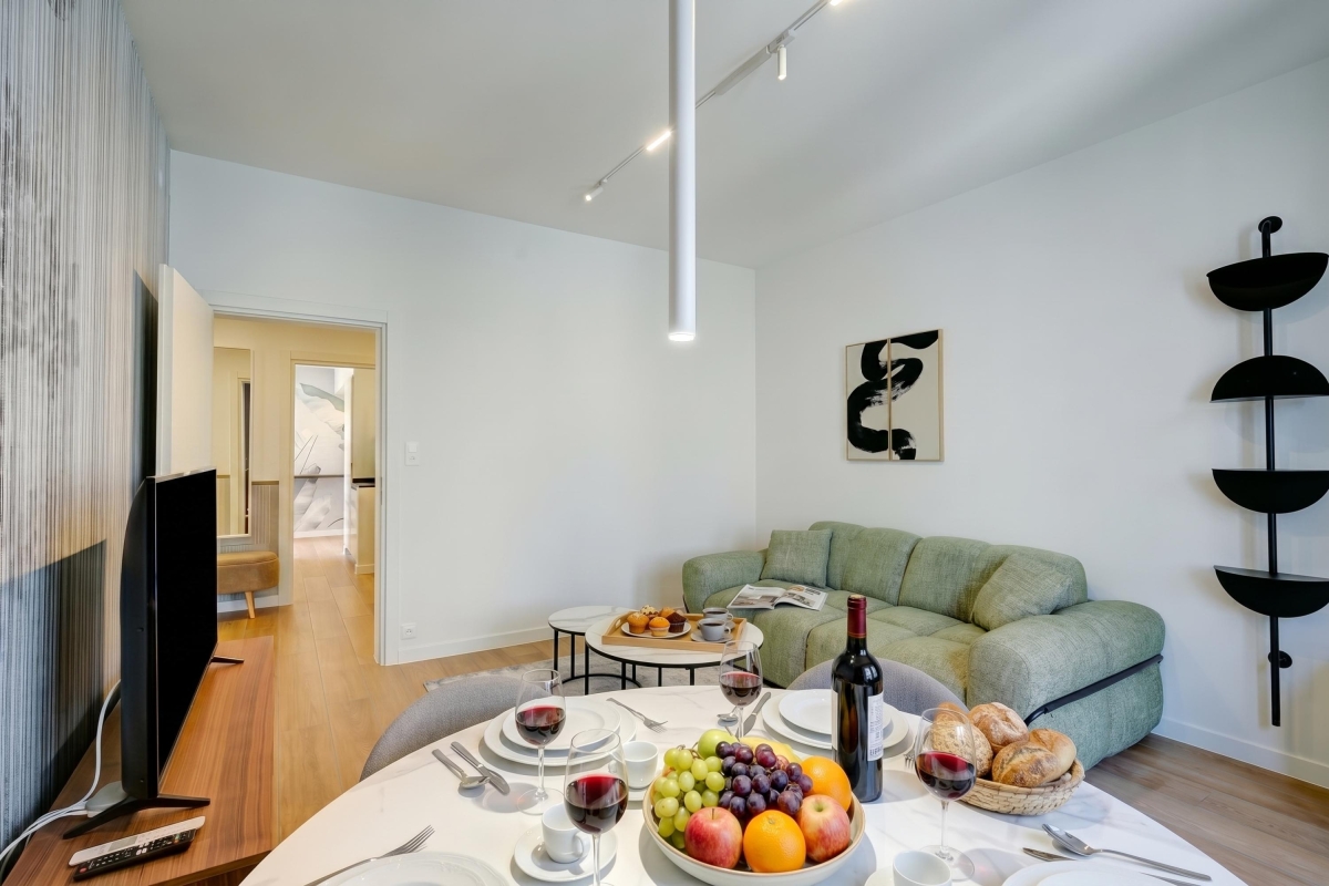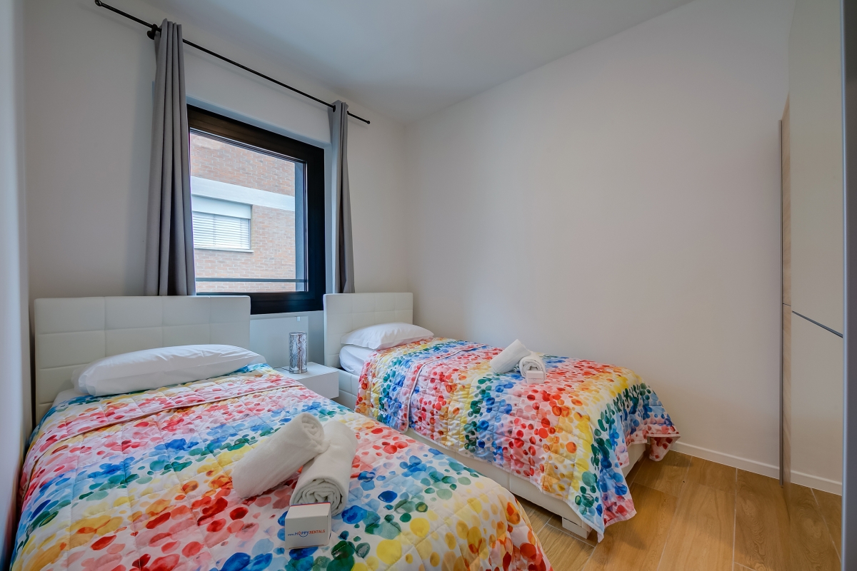 On the fourth floor (with lift) of a recent development, this 2-bedroom flat sleeps 6 people. The airy living room has a large window and a glass door, leading onto a balcony overlooking the street. There is a large sofa (which converts into a double bed), a Smart TV and a contemporary dining table with 6 chairs. There is plenty of space for people to relax with friends or work in comfort.