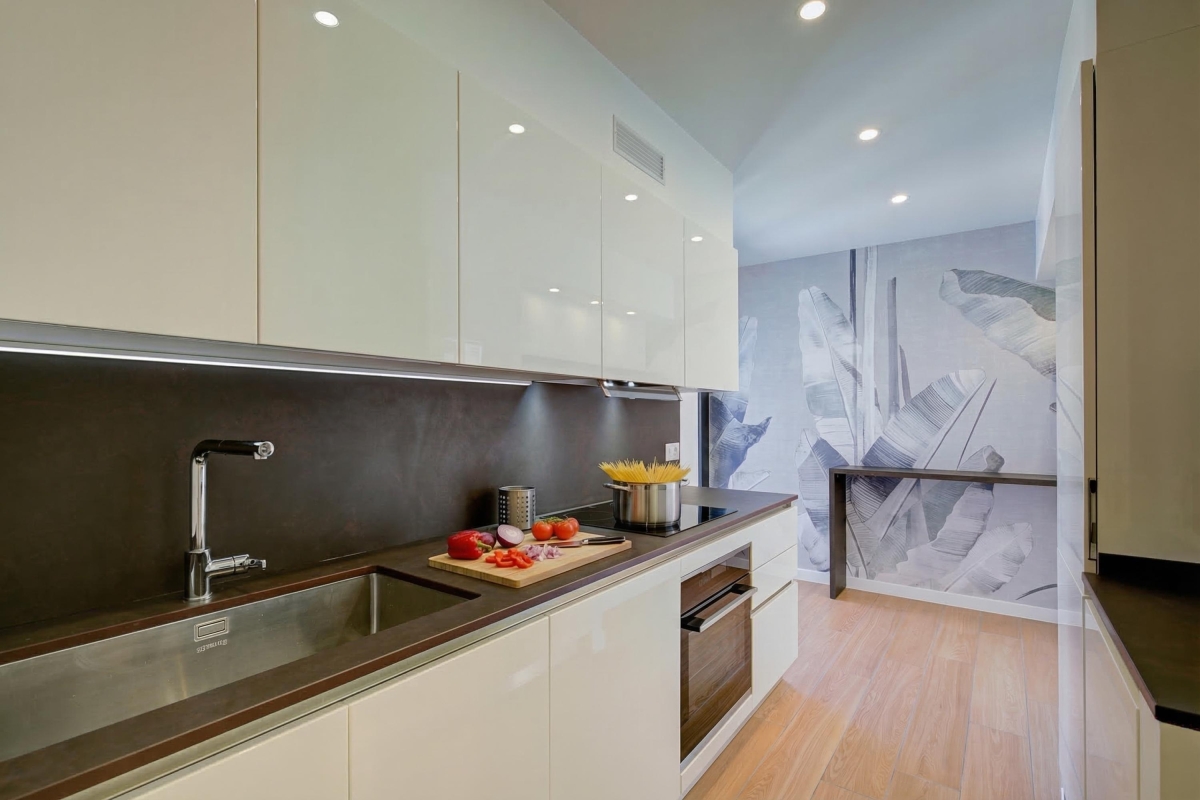 The spacious, modern kitchen has a breakfast bar next to the large glass door that leads out onto another little balcony. It is equipped with everything you might need for your stay: an induction hob, oven, microwave, dishwasher, washing machine, fridge, freezer and a Nespresso machine.