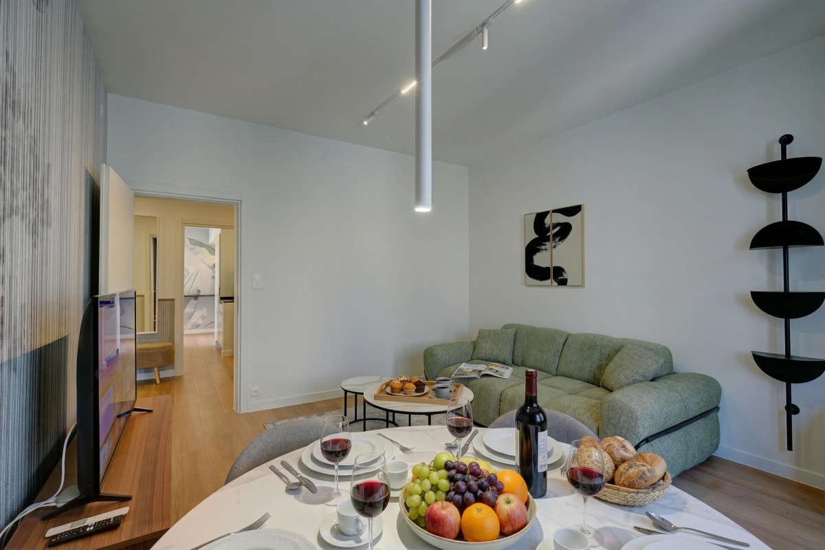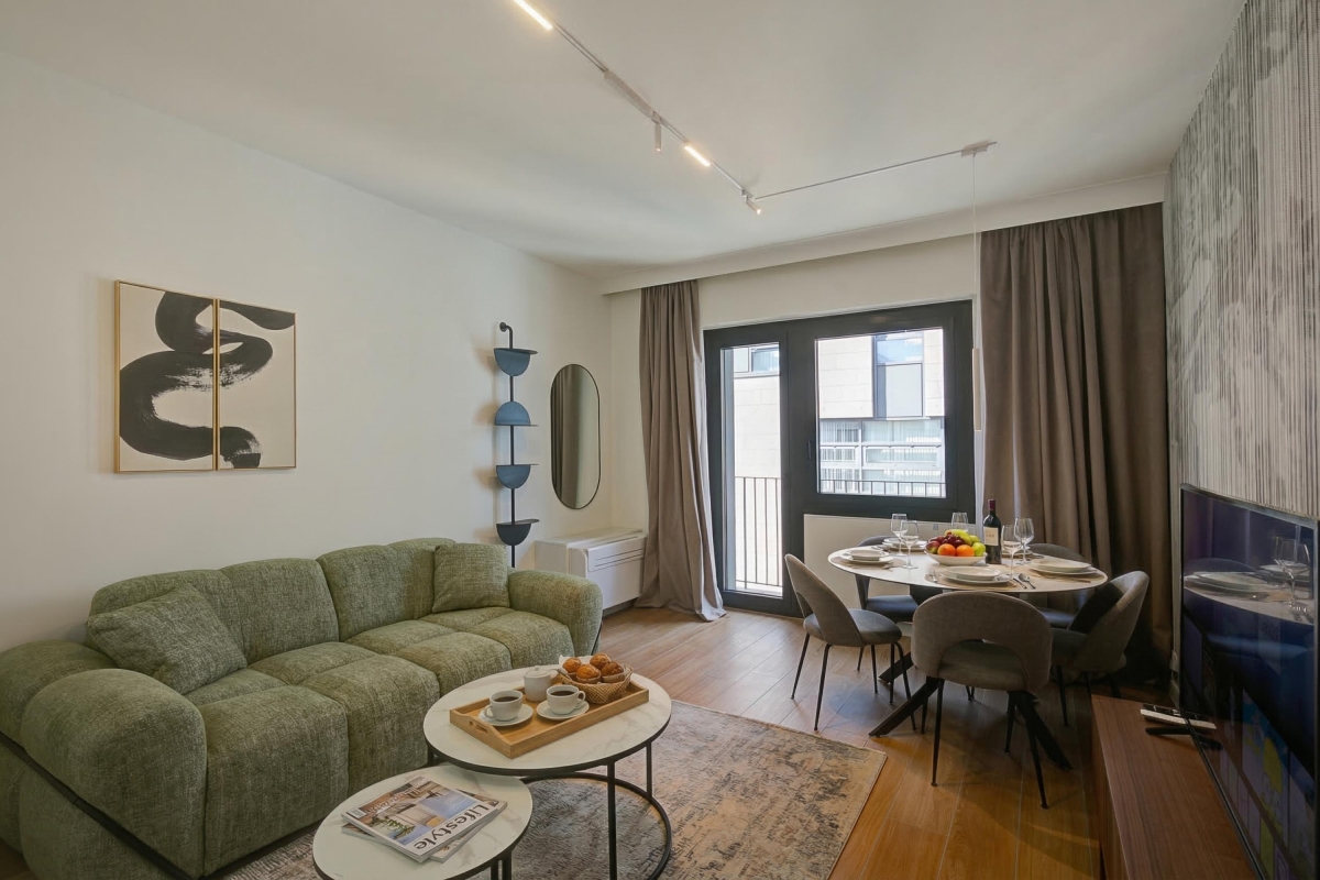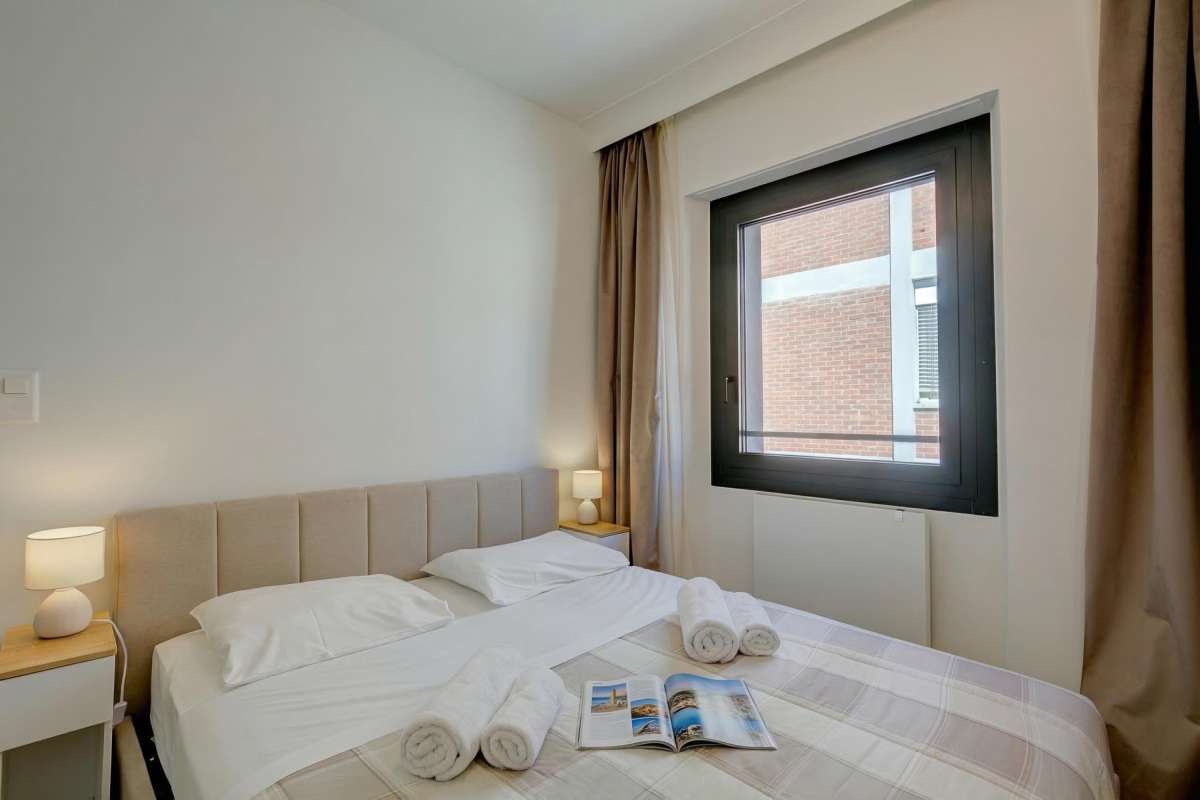 On the third floor (with lift) of a recent development, with pale wooden floors throughout, this 2-bedroom flat sleeps 6 people. The airy living room has a large window and a glass door, leading onto a balcony overlooking the street. There is a large sofa (which converts into a double bed), a Smart TV and a contemporary dining table with 6 chairs.