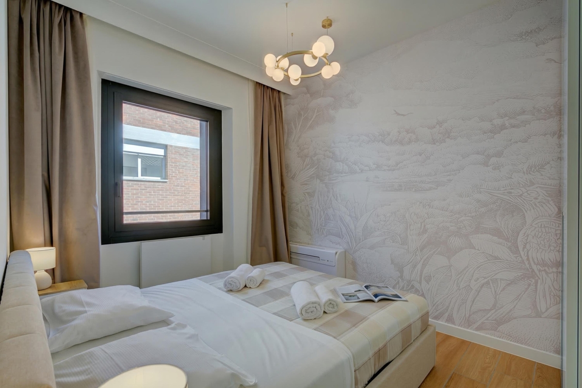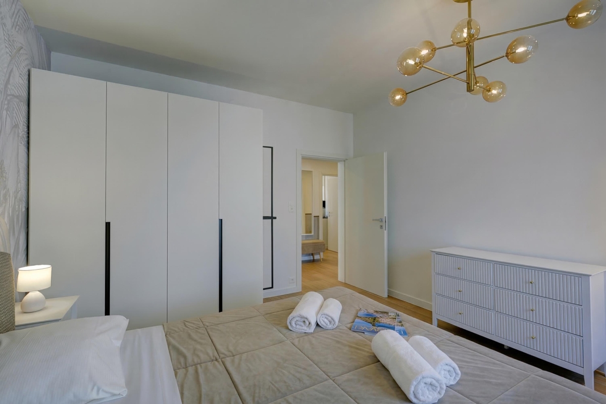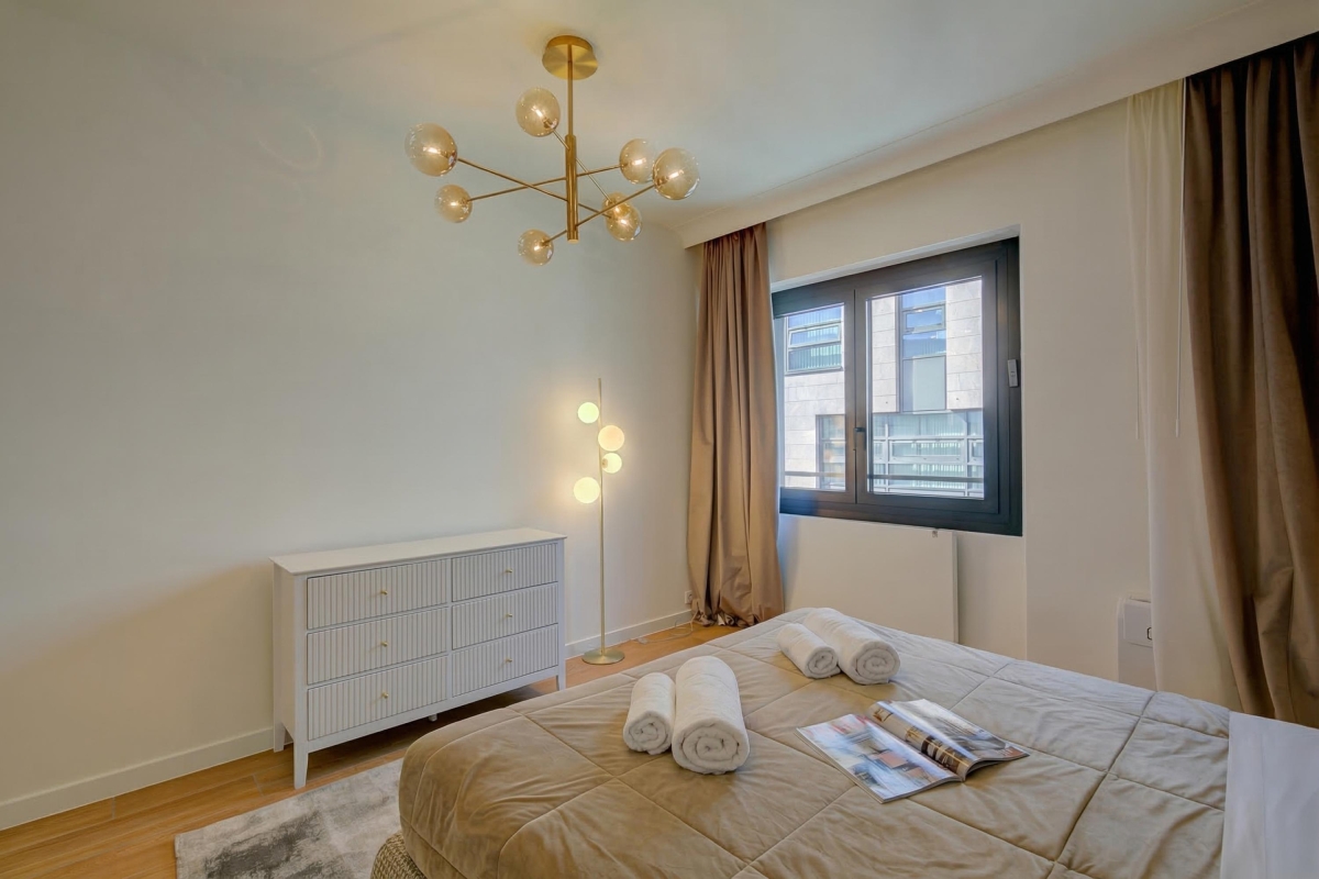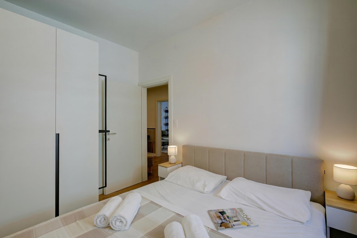 On the third floor (with lift) of a recent development, with pale wooden floors throughout, this 2-bedroom flat sleeps 6 people. The airy living room has a large window and a glass door, leading onto a balcony overlooking the street. There is a large sofa (which converts into a double bed), a Smart TV and a contemporary dining table with 6 chairs.