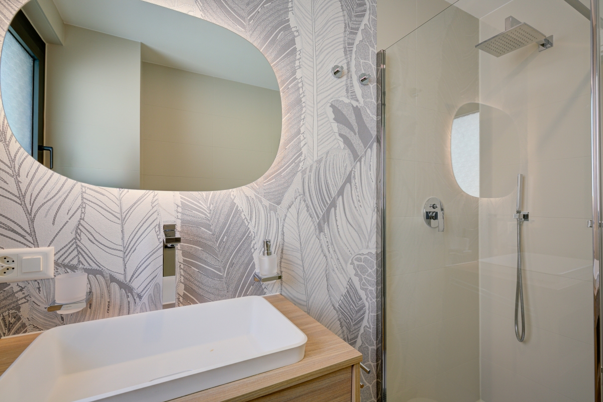 The beautiful, stone-tiled bathroom, off the entrance hall, is equipped with a modern glass shower, bidet, large basin and WC