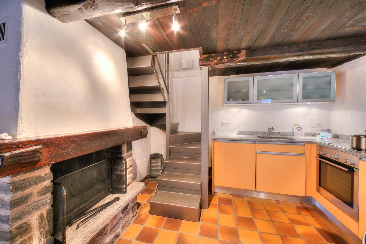 The ground floor, which opens directly onto the terrace, has an open-plan kitchen/dining room with a stone fireplace. There is a dining table and chairs and a modern kitchen. The kitchen is equipped with an induction hob, oven, fridge/freezer and Mokka coffee machine. A modern staircase leads up to the first-floor living room, with a contemporary leather sofa and chest of drawers.