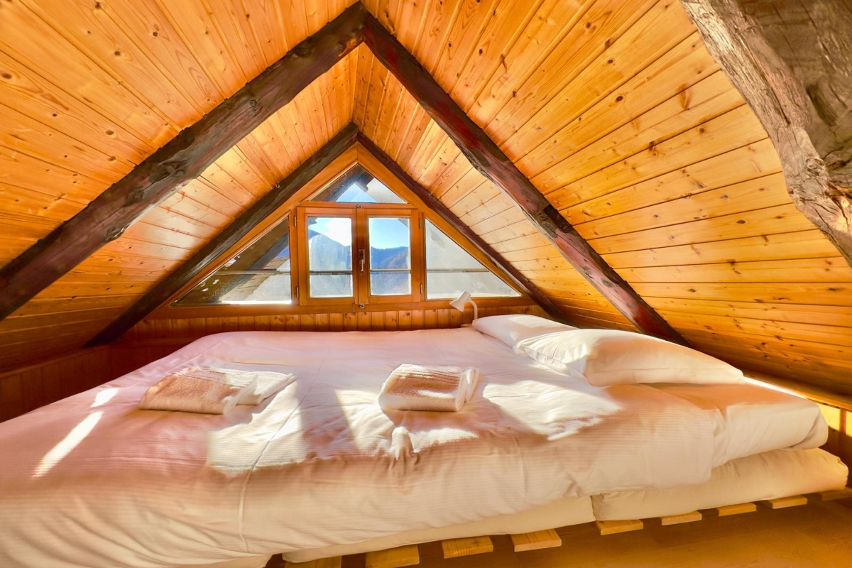 Bedroom: The 2nd-floor bedroom is tucked under the wooden eaves and is furnished with a double bed