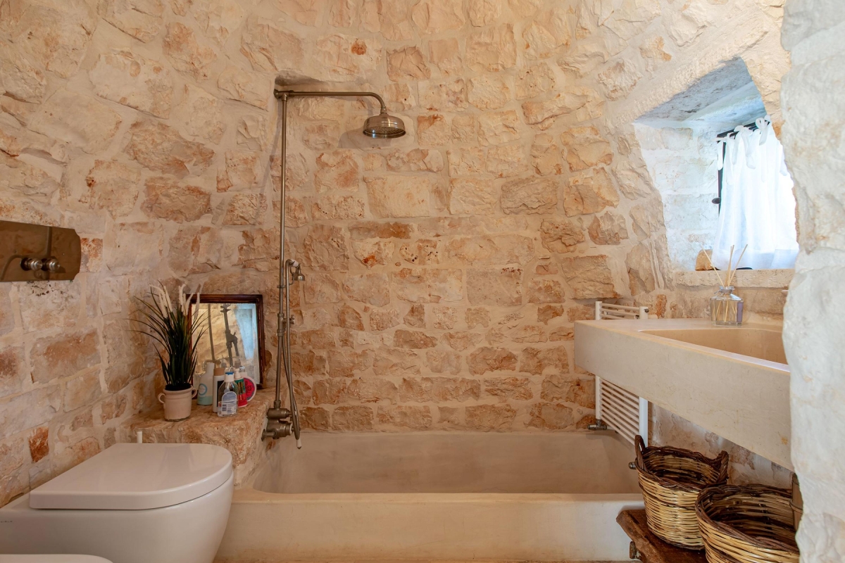 The interiors have been luxuriously restored with a combination of traditional and contemporary finishes. The designer’s passion for high-quality, recycled materials, such as ancient wood, is evident throughout the property. The separate trulli, with private entrances, are grouped around the central trulli. Here guests can enjoy the vaulted sitting room, built of pale local stone, which has an open fireplace, sofas and a Smart TV. The dining room, under the central dome of the house, has high ceilings, wooden beams and beautiful rough stone floors. A large archway leads through to the kitchen, which is well equipped with a cooker hob, oven, dishwasher, American fridge, freezer and Nespresso coffee machine. One of the other 2 kitchens is a semi-professional, steel kitchen.