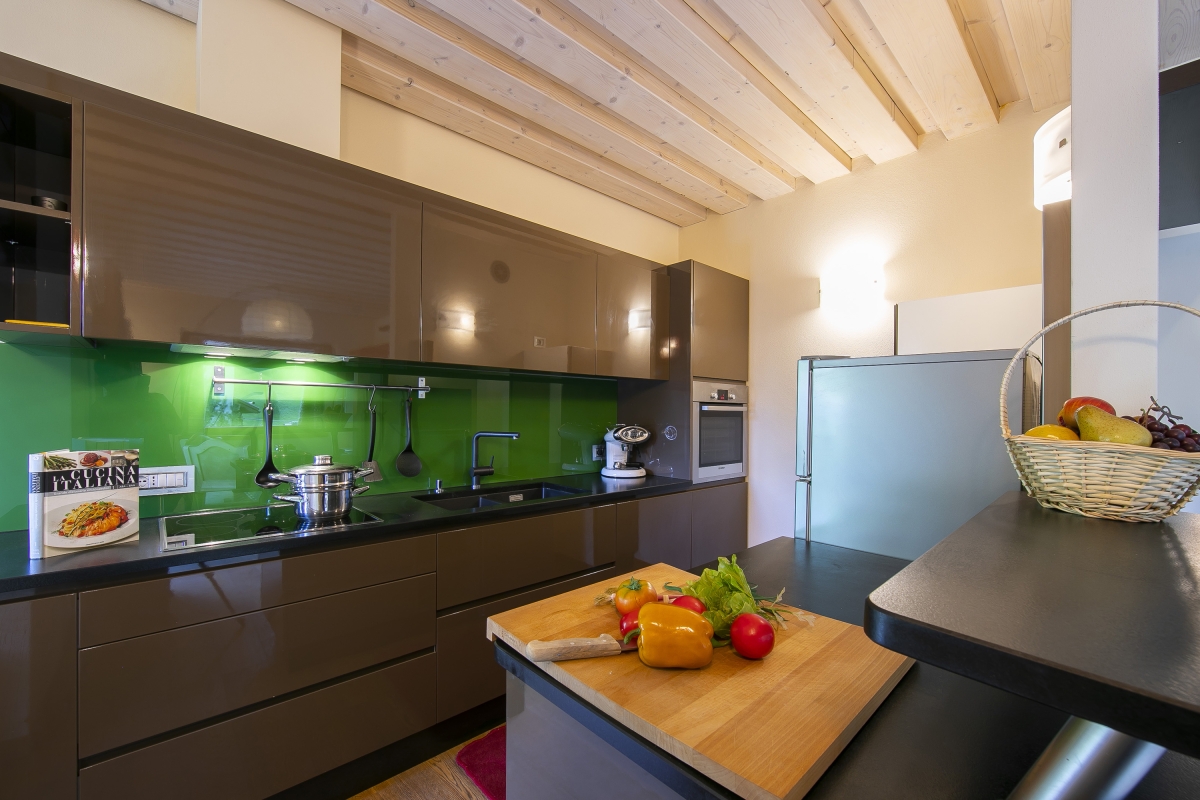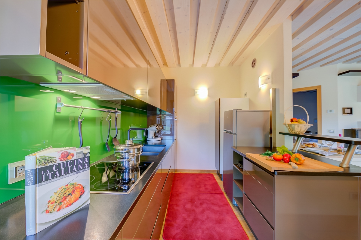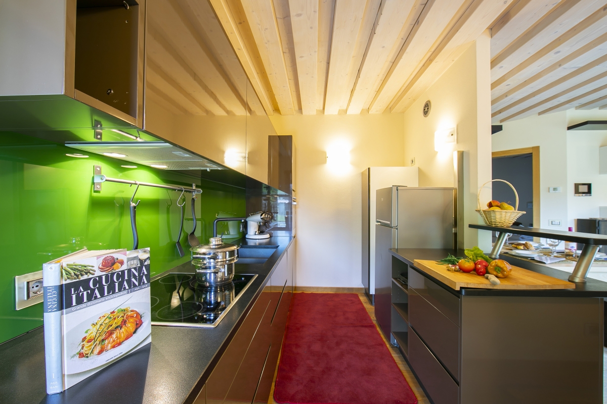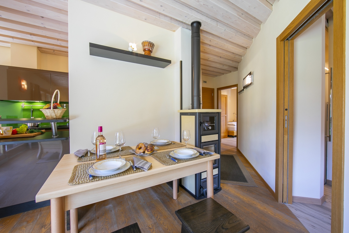 Inside, the ground-floor apartment, through multiple doors, provides easy access and maximum connection to the peaceful mountain view outdoors. The living room is furnished with a massive flatscreen TV, a coffee table, sofa chairs and a dining table. It also enjoys direct access to the garden, and thanks to large picture windows, the room is naturally lit with delightful sunshine. To make your stay absolutely carefree, the apartment has a modern-style kitchen with every utility; from a dishwasher to microwave, coffee machine and fridge at your disposal.