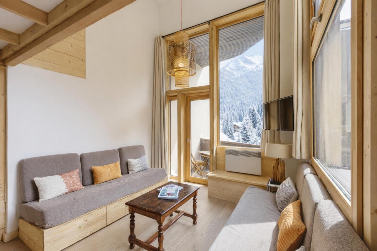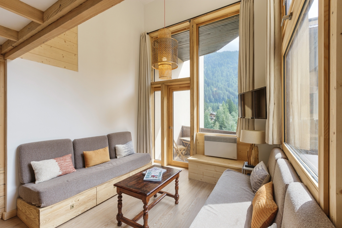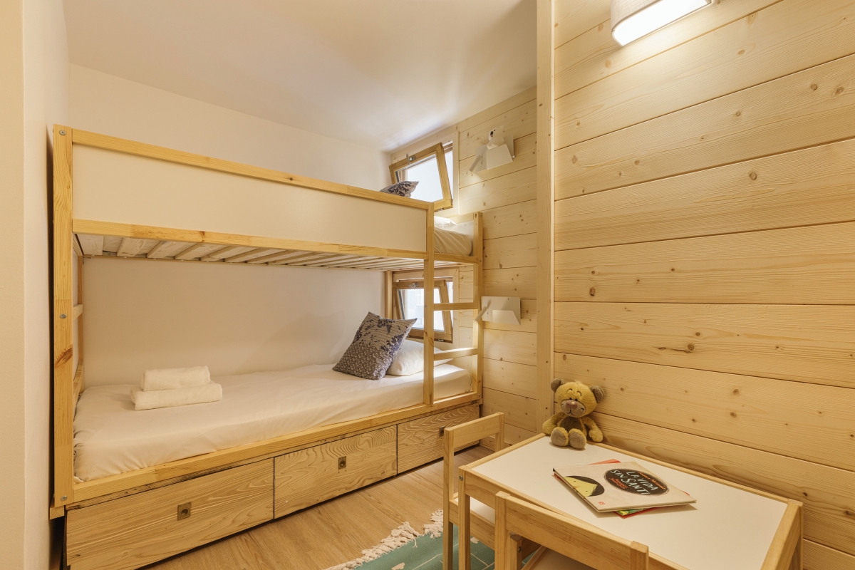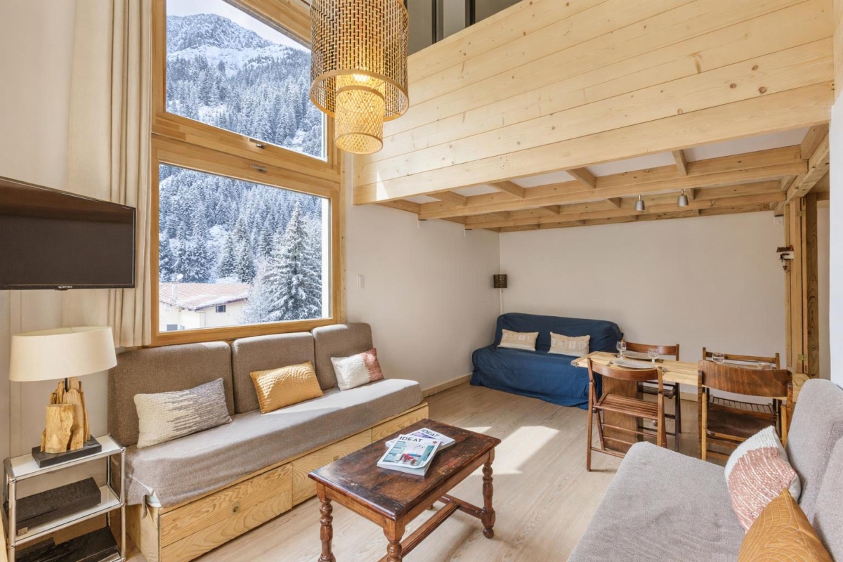 On the second floor (with lift), set in extensive communal gardens, this apartment sleeps 4 people. The décor is alpine, but with a contemporary twist. The double-height living room is flooded with sunlight thanks to large windows which look directly onto the mountains. There is a glass door that leads out onto a wooden balcony where you can sit and enjoy the view. Back indoors in the living room, there are 3 sofas and a Smart TV. The dining area, with a wooden table that seats 4, is next to the open-plan kitchen. The kitchen, which can be closed off from the living area, is equipped with a cooker hob, oven, dishwasher, fridge.