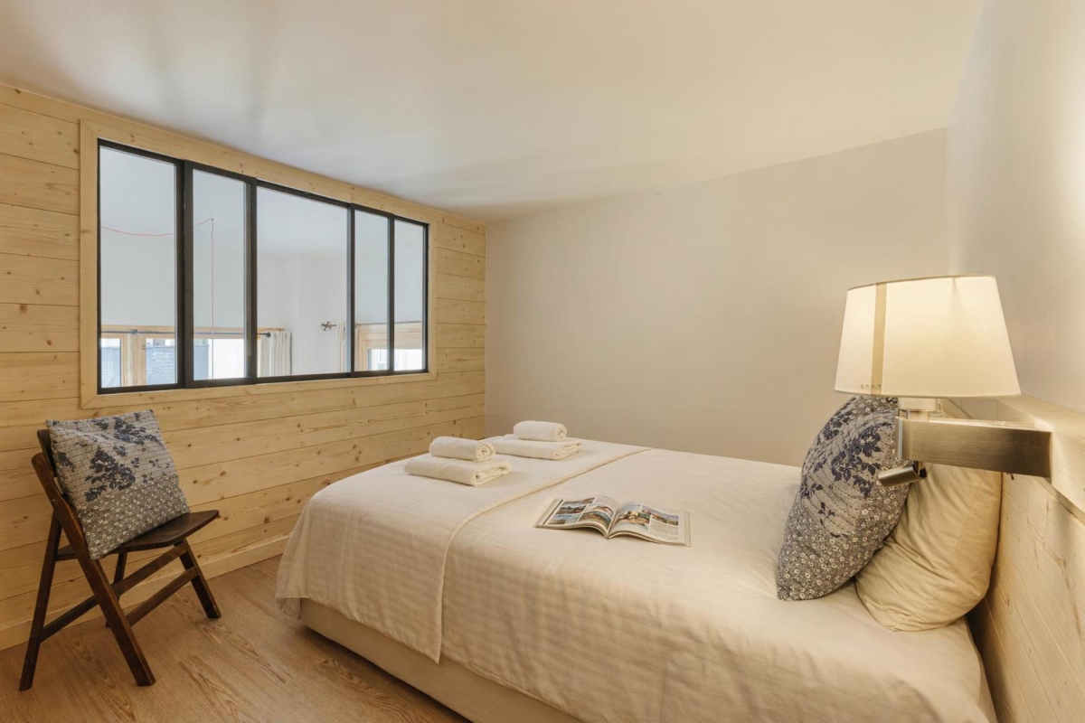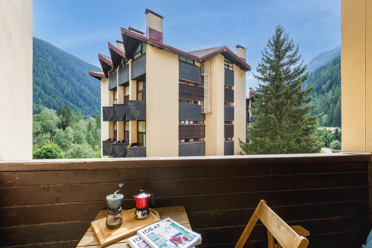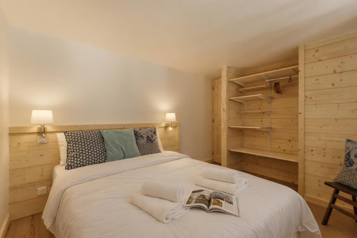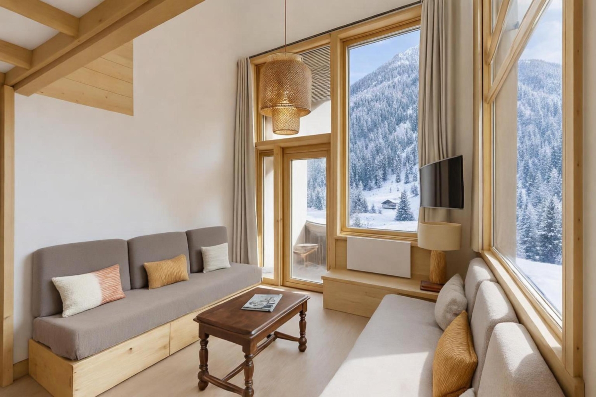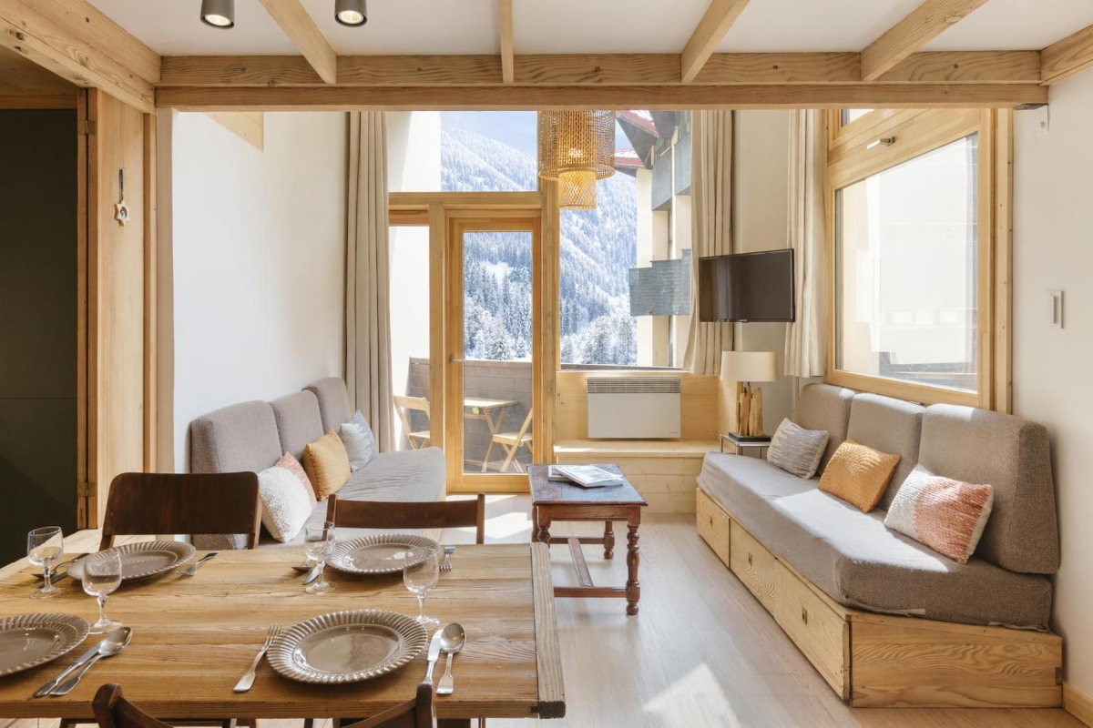 On the second floor (with lift), set in extensive communal gardens, this apartment sleeps 4 people. The décor is alpine, but with a contemporary twist. The double-height living room is flooded with sunlight thanks to large windows which look directly onto the mountains. There is a glass door that leads out onto a wooden balcony where you can sit and enjoy the view. Back indoors in the living room, there are 3 sofas and a Smart TV. The dining area, with a wooden table that seats 4, is next to the open-plan kitchen. The kitchen, which can be closed off from the living area, is equipped with a cooker hob, oven, dishwasher, fridge.
