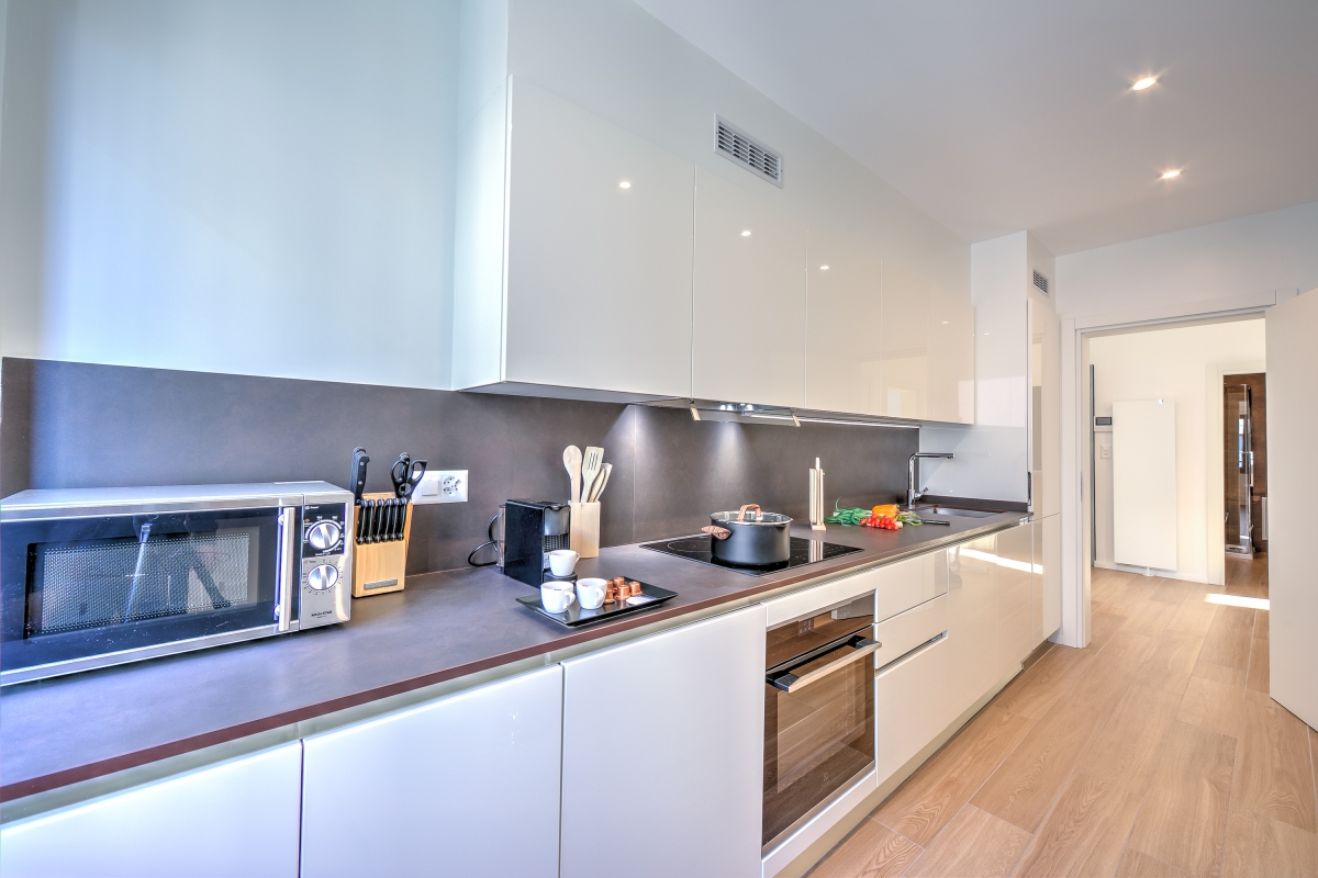 On the 4th floor (with lift) of an elegant apartment block, the air-conditioned apartment sleeps 4 people. It is flooded with sunlight and has been thoughtfully equipped with anything a guest might need for their stay. With wooden floors throughout, the apartment is arranged around a spacious entrance hallway. The corner living room has large windows on two walls and a glass door, leading onto a balcony overlooking the street. There is a comfortable sofa (which converts into a double bed), a large Smart TV and a contemporary dining table with 4 chairs. It is an ideal space to relax with friends or family.