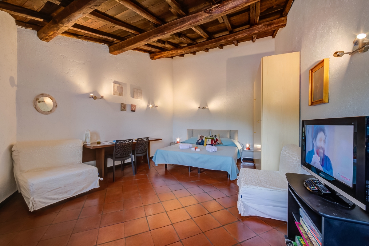 Bedroom: The master bedroom, reached via stone steps from the living room, has a double bed, sofa and armchair, a flatscreen TV, laptop workspace and a large wardrobe.
