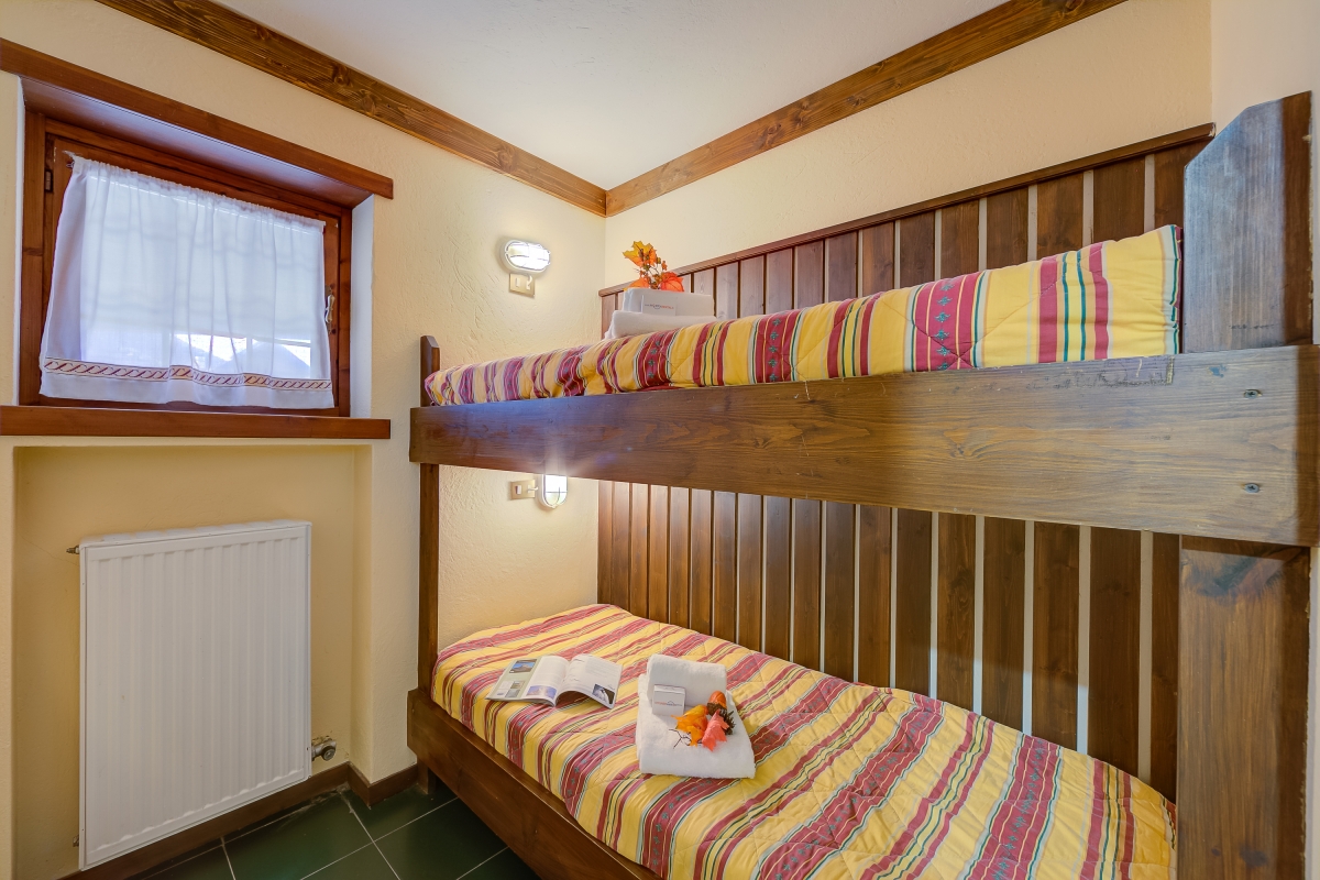 Bedroom: The bedroom has a bunk bed and a wardrobe.