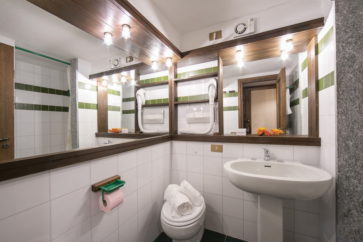 This second-floor apartment (with lift) is stylish and practical. The alpine-style living area, with green tiled floors throughout, has a corner sofa facing a flatscreen Smart TV, large wooden dresser and a small balcony. Slightly separated from the seating area, and next to the kitchenette, is a wooden dining table with seating for 4 people. The open-plan kitchenette is equipped with a cooker hob, microwave and fridge.