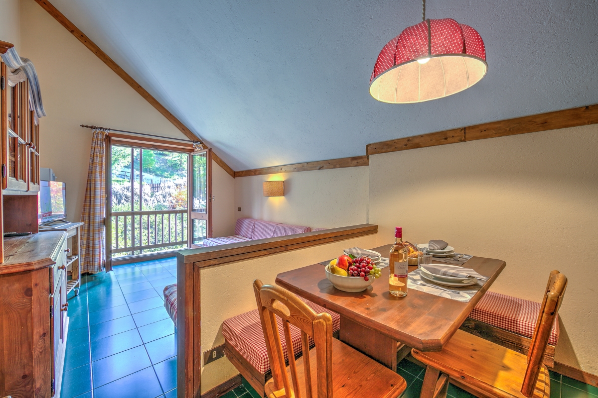 The living area, under the pitched roof, has a corner sofa with a flat-screen TV and a traditional wooden dresser. French windows in the living area open onto an attractive wooden balcony, which looks out over the mountainside. The dining table, next to the open plan kitchen area, has seating for 4 people, whilst the kitchenette is equipped with a cooker hob, microwave and fridge.