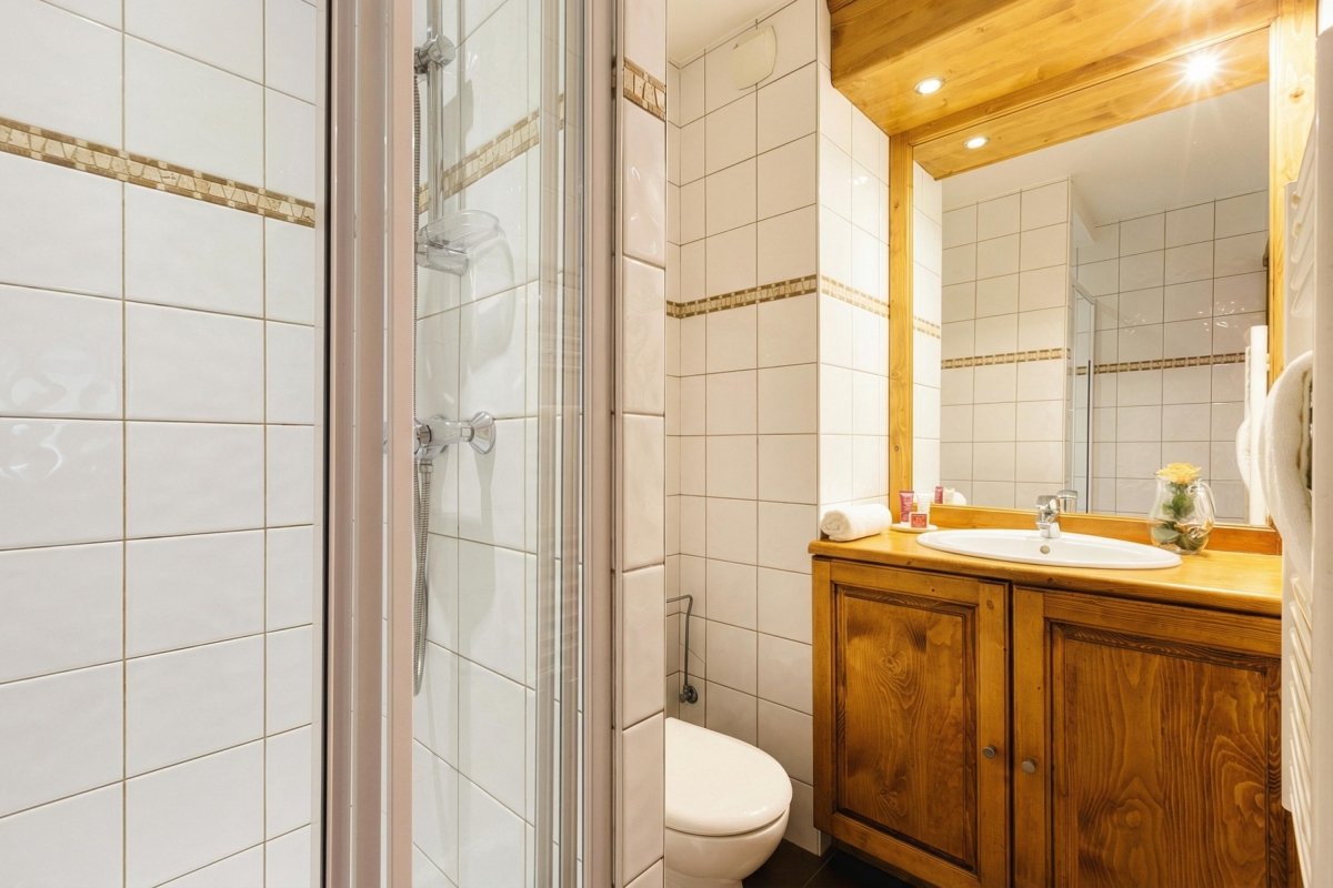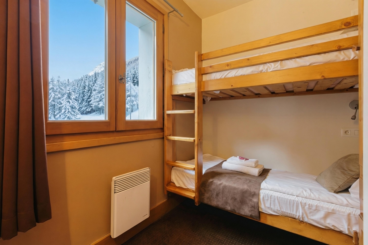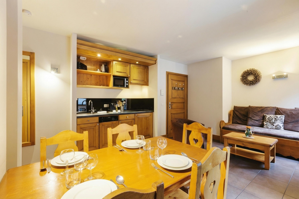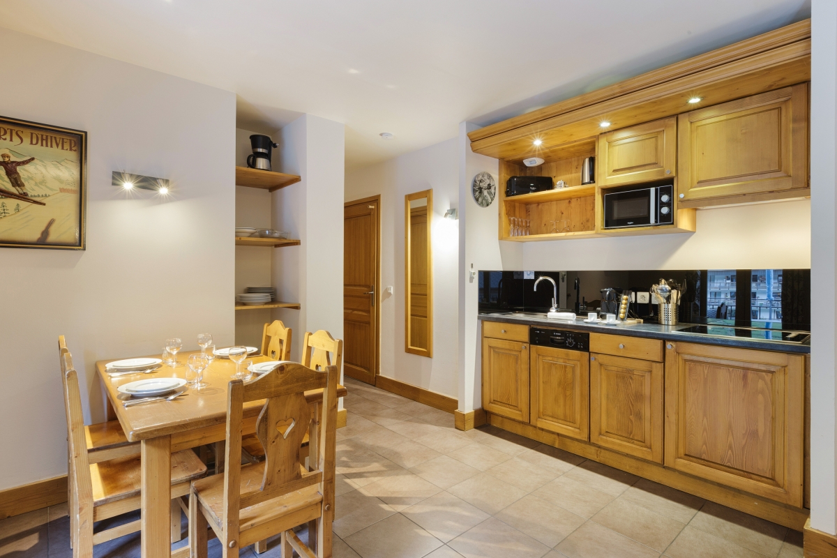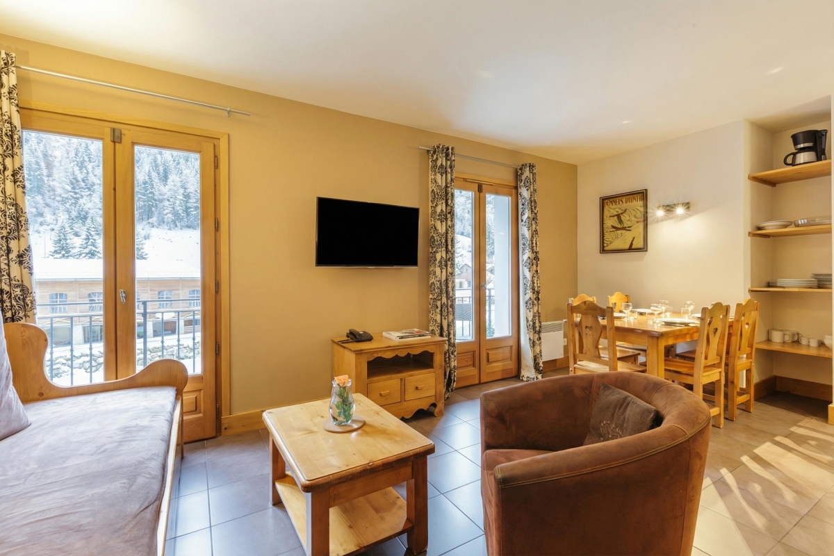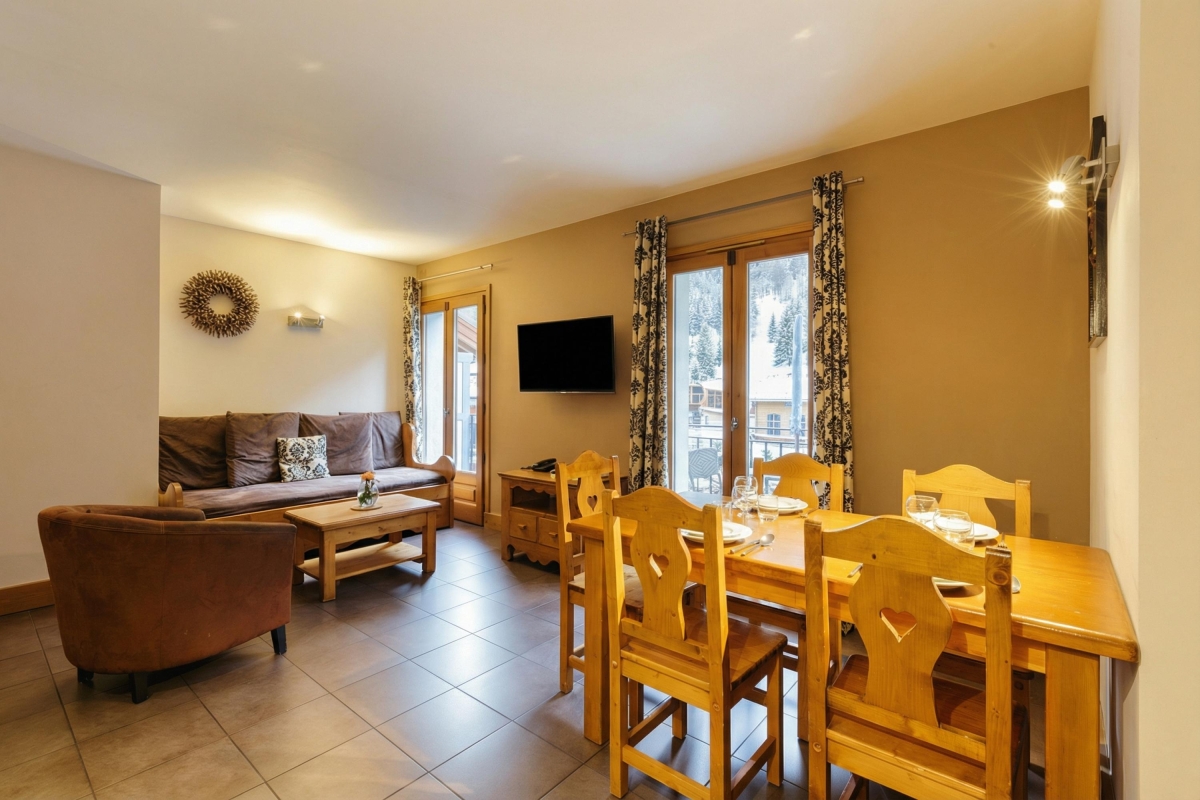 The apartment sleeps 5 people. The bright open-plan living room has a comfortable sofa, armchair and a flat-screen TV. Two sets of French windows open out onto the private balcony, with a table and chairs, where guests can relax and enjoy uninterrupted mountain views. Back indoors, the dining table seats 5 people and is next to the modern, fitted kitchen, which is fully equipped with an induction hob, microwave, dishwasher, fridge/freezer, Nespresso and coffee machines.