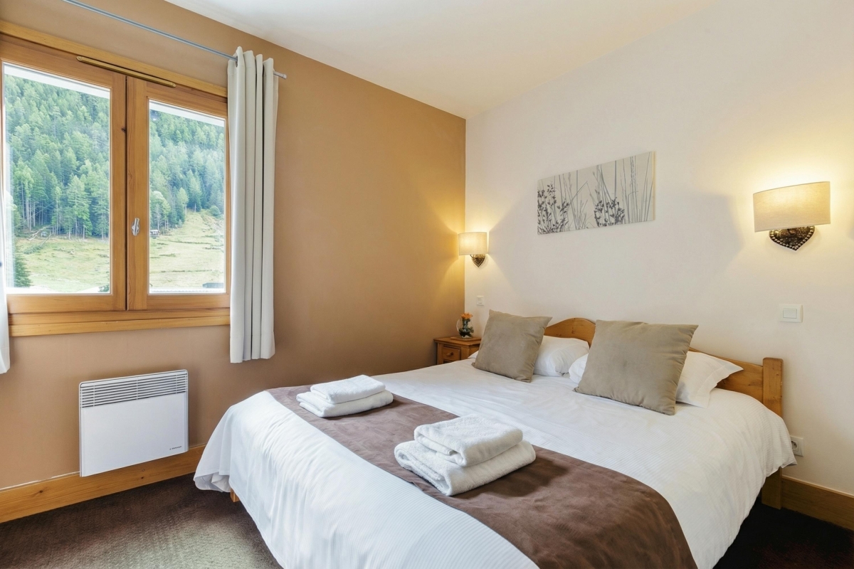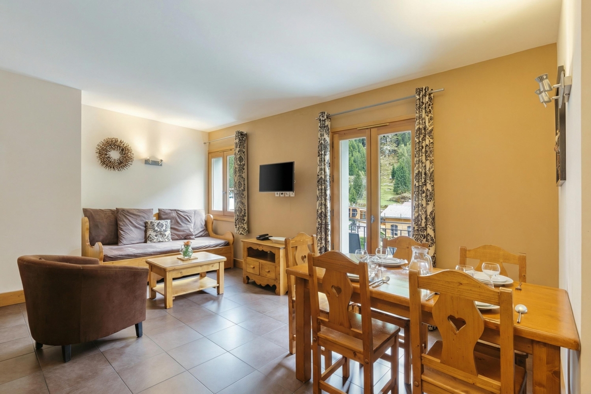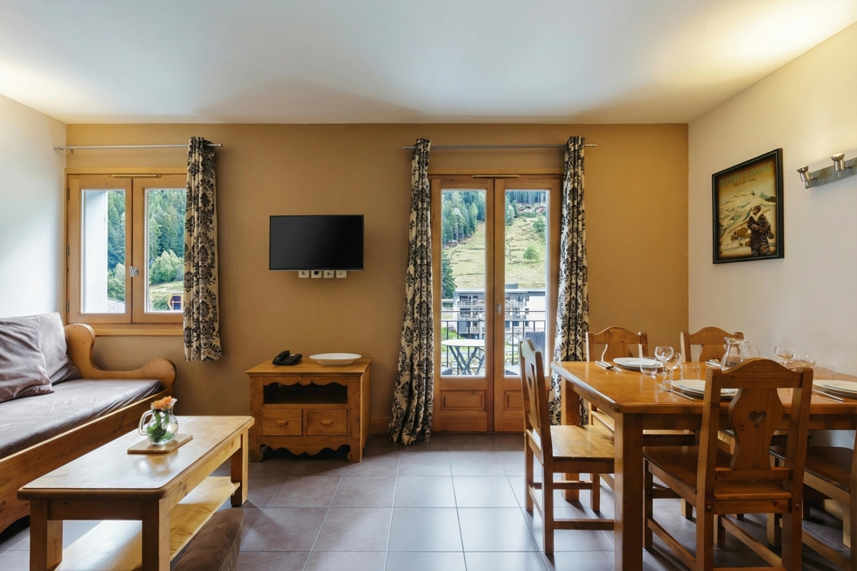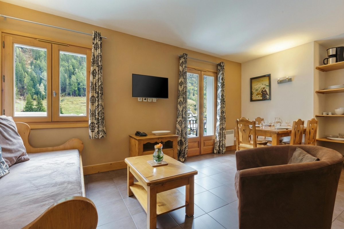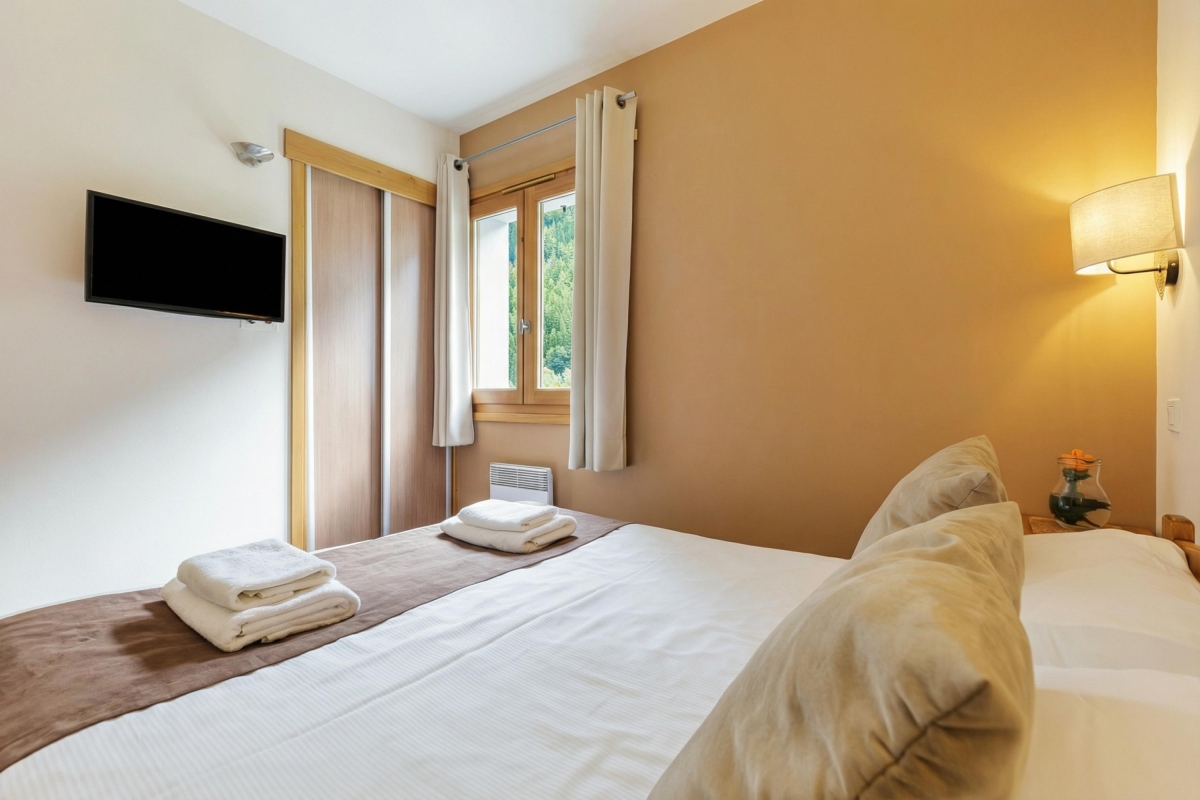 The apartment sleeps 5 people. It is thoughtfully equipped with everything guests might need for a comfortable stay. The airy living room has a large sofa, a stylish leather armchair and a flat-screen TV. French windows lead out onto a private balcony, with a table and chairs, where guests can relax and enjoy the views over the L’Eau Noire river to the mountainside. Indoors, the dining table seats 5 people and is next to the modern, fitted kitchen, which is fully equipped with an induction hob, oven, microwave, dishwasher, fridge/freezer, Nespresso and coffee machines.