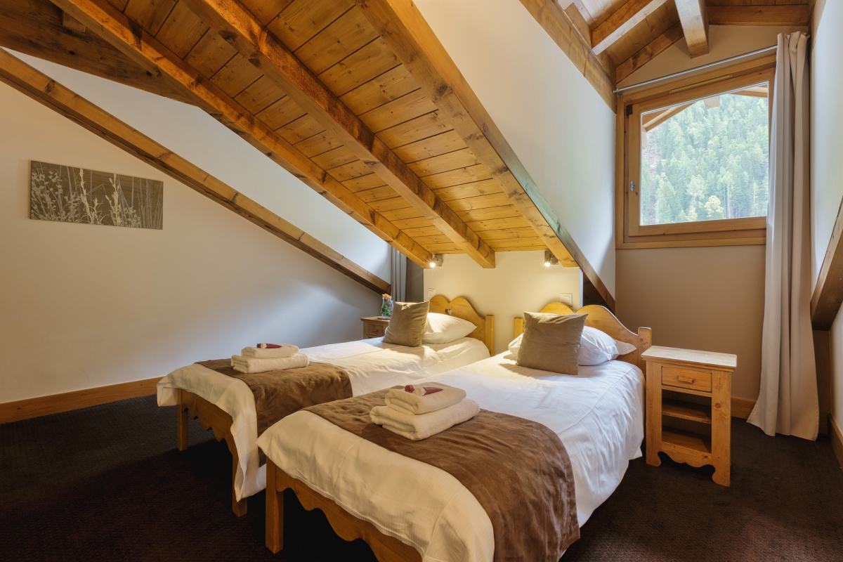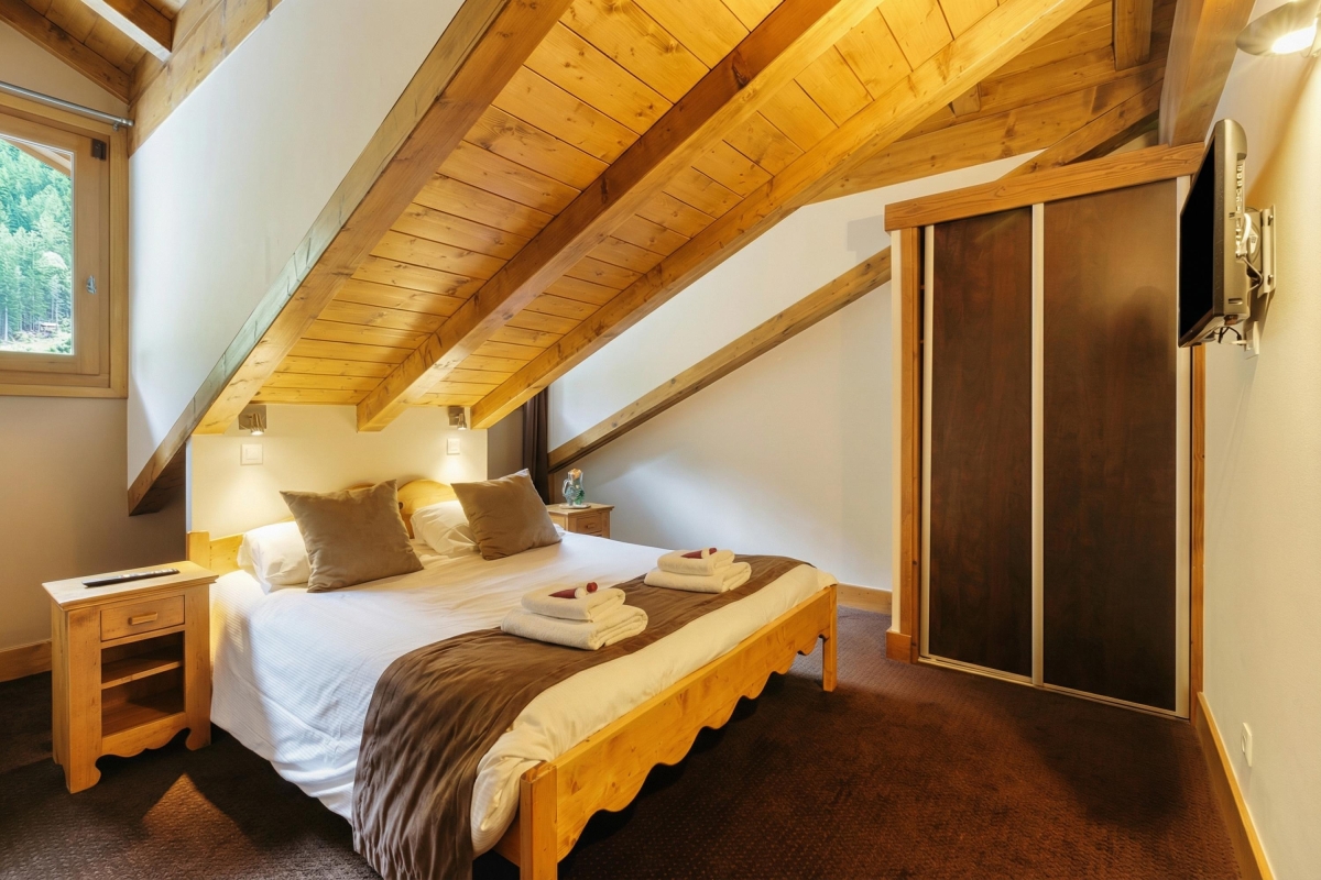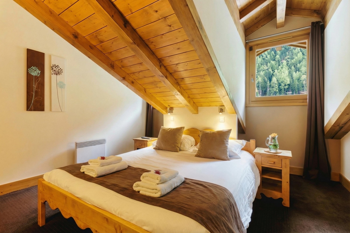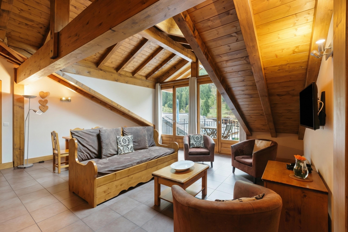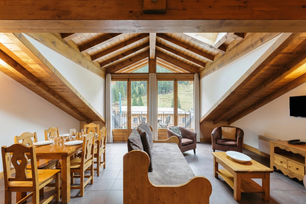 The apartment sleeps 5 people, and has been carefully equipped with everything guests might need during their stay. Tucked under the wooden eaves, the living room has double French windows opening onto a balcony with wonderful mountain views. There is a table and chairs on the balcony, ideal for al fresco dining. In the main living area, there are stylish leather armchairs, a sofa, a coffee table and a flat-screen TV. The dining area has a table for 6 people. The kitchen is equipped with an induction hob, oven, microwave, dishwasher, fridge/freezer, Nespresso and coffee machines.