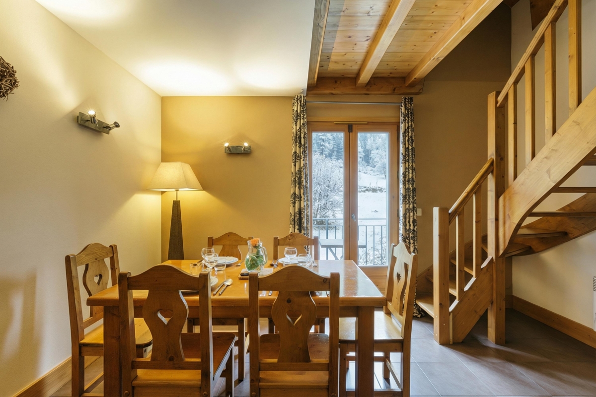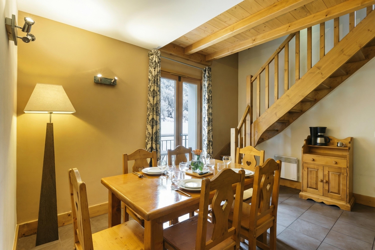 On the 5th floor (with lift), this apartment sleeps 5 people and has been thoughtfully equipped with everything guests might need for a comfortable stay. On the lower floor of the duplex, there is a dining area with a table for 6 people, a flat-screen TV and an open-plan, fitted kitchen. The kitchen is equipped with an induction hob, microwave, dishwasher, fridge/freezer, Nespresso and coffee machines. French windows in the dining room lead out onto a balcony, with a table and chairs and spectacular views out over the mountainside.