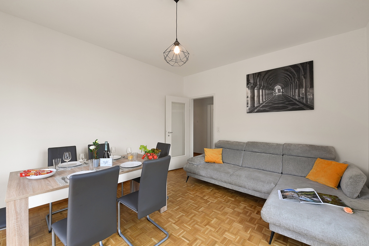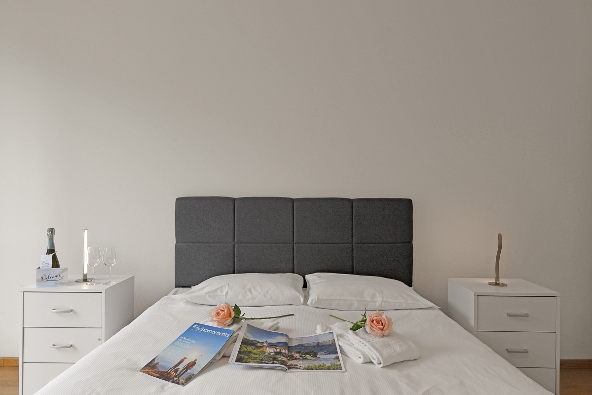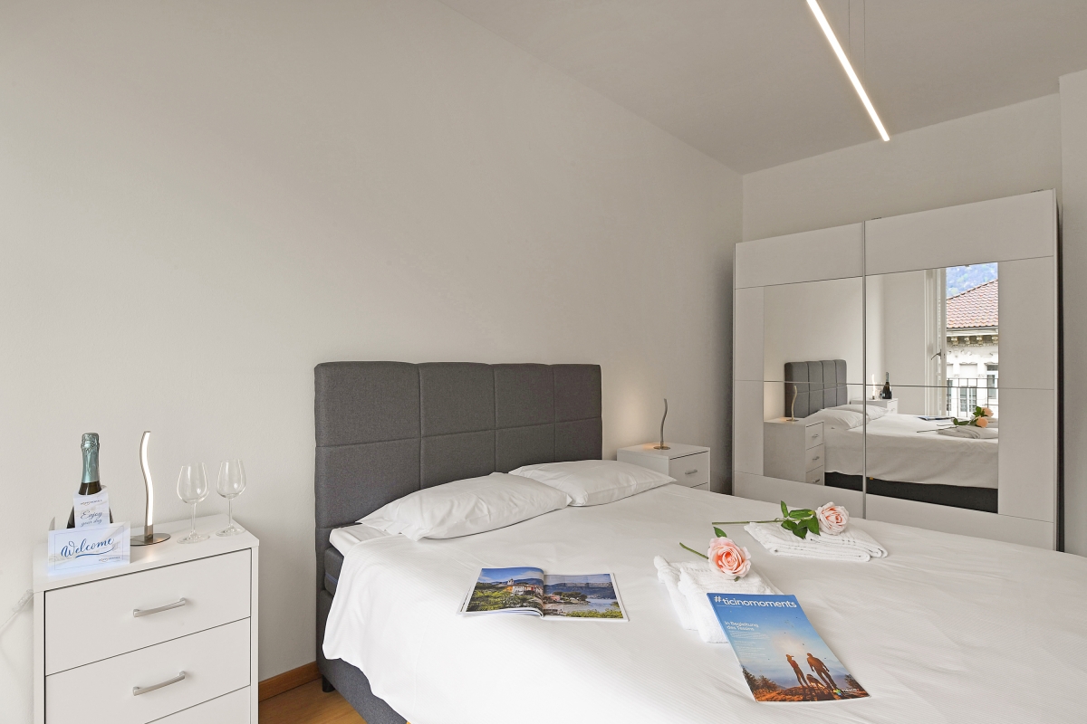 Enjoying a panoramic fifth-floor location with convenient lift access, this modern balcony apartment is perfect to soak up the best of the historic city of Bellinzona. The apartment is located just a short walk from the ancient castles as well as the amenities needed for an essentially carefree stay. Inside, the large living room has an open layout that directly gives out onto the balcony. This room also has a Smart TV and indoor dining. The kitchen of the 2-bedroom apartment is fully functional and has a microwave, oven, fridge, Nespresso machine and an induction hob!