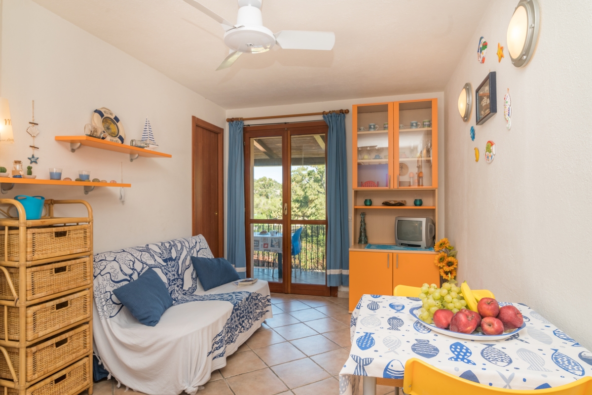 This first-floor apartment consists of a living room with a TV, an open kitchenette with an oven and cooker hob and direct access to a covered veranda with alfresco lounging. A few steps from the main square of the Ladunia residence, a restaurant/bar and market are available from June to September for your added convenience.