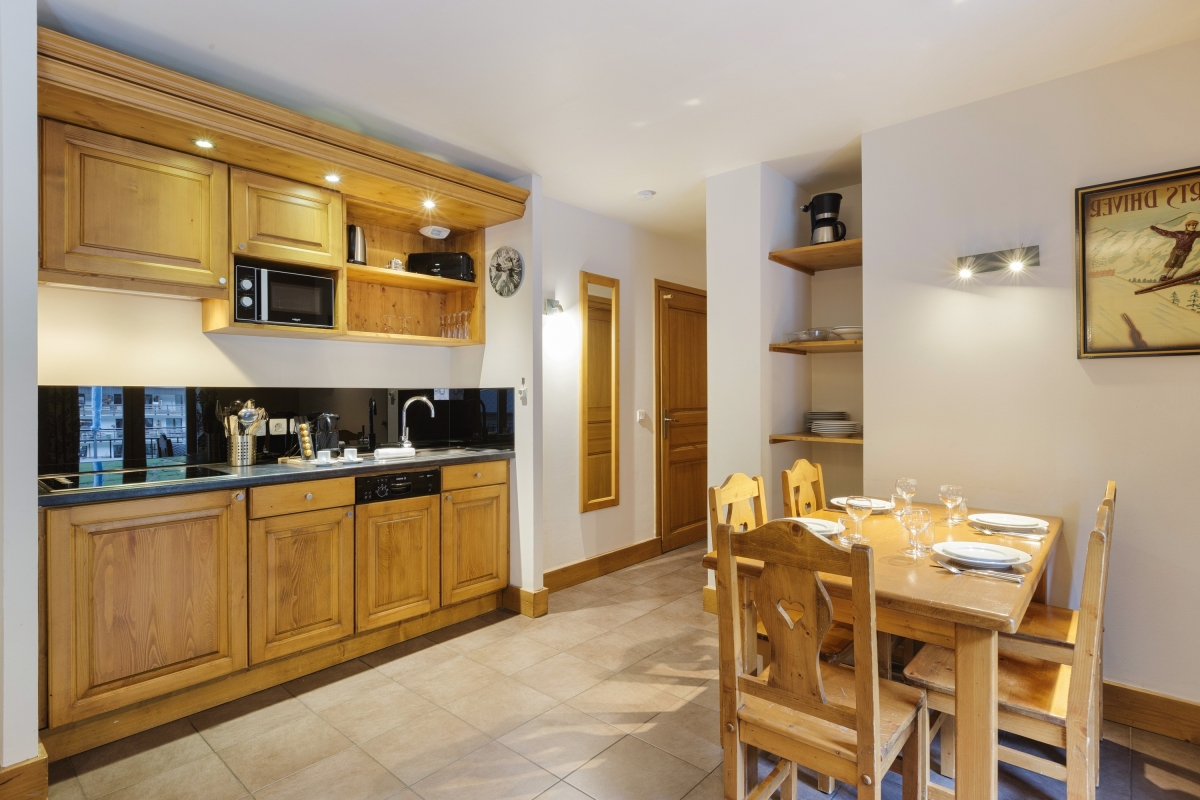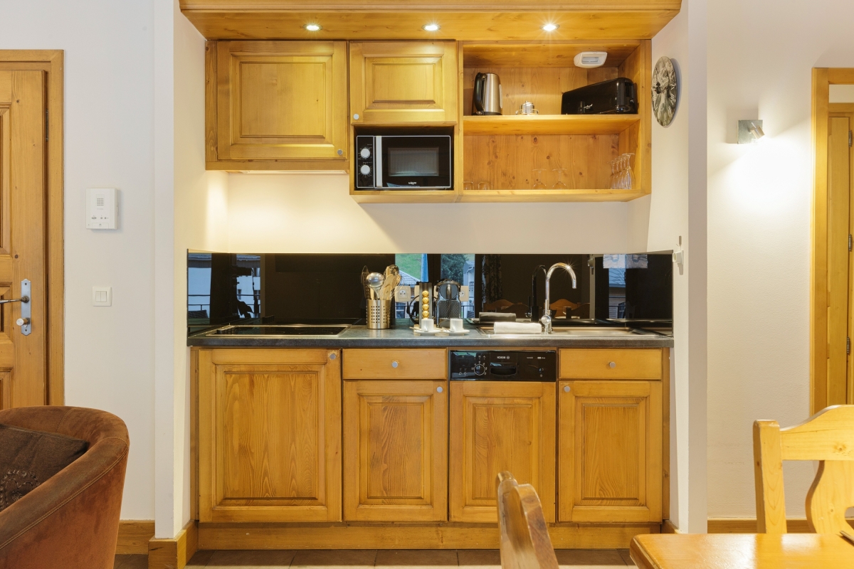 The open-plan living room has a comfortable sofa, an armchair and a flat-screen TV. Two sets of glass doors open onto the balcony with a table and chairs. Here, guests can dine al fresco on the wooden decking and enjoy the mountain views. Back indoors, the dining table seats 5 people. Close by is the open-plan kitchen, which is fully equipped with an induction hob, oven, microwave, dishwasher, fridge/freezer, Nespresso and coffee machines.
