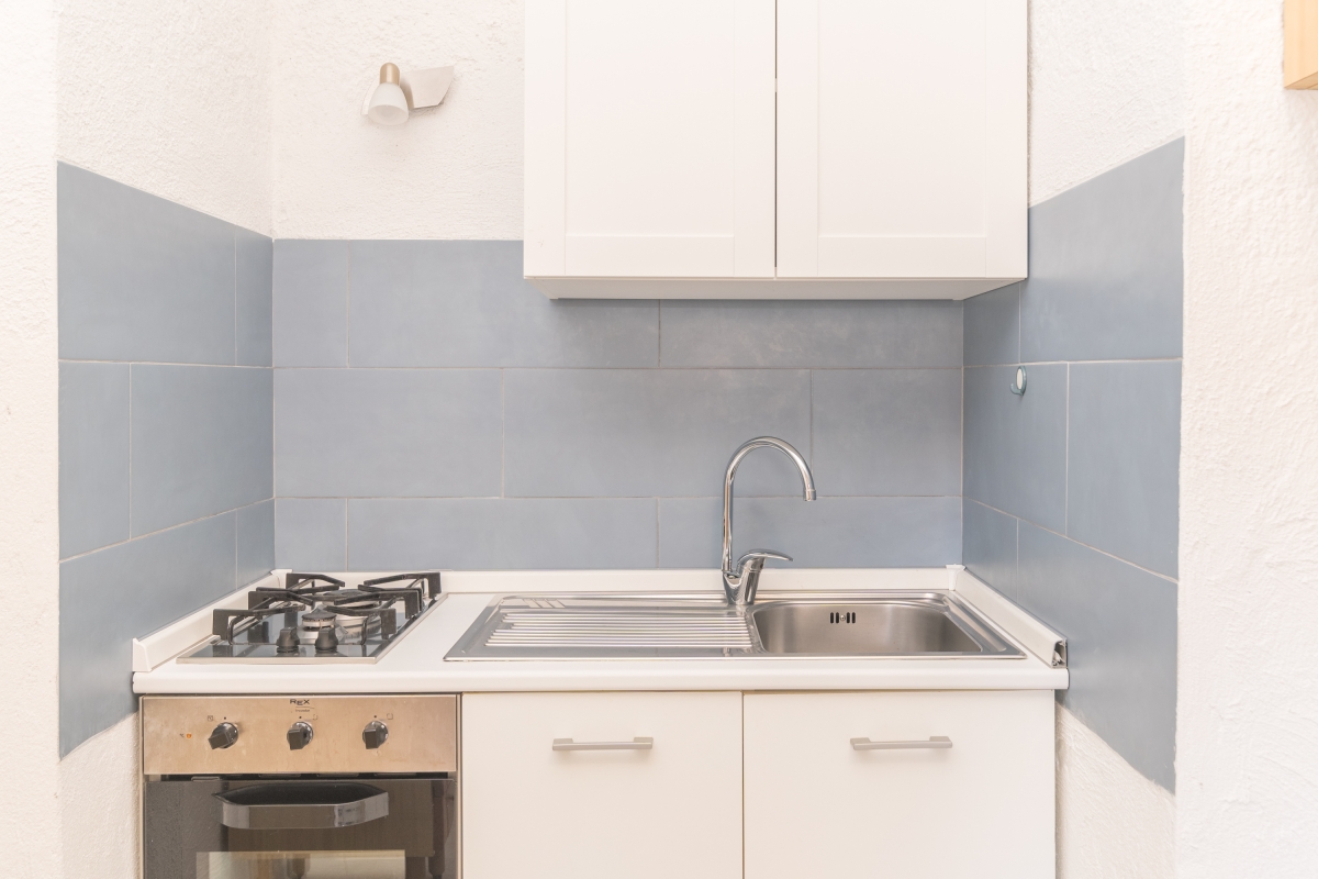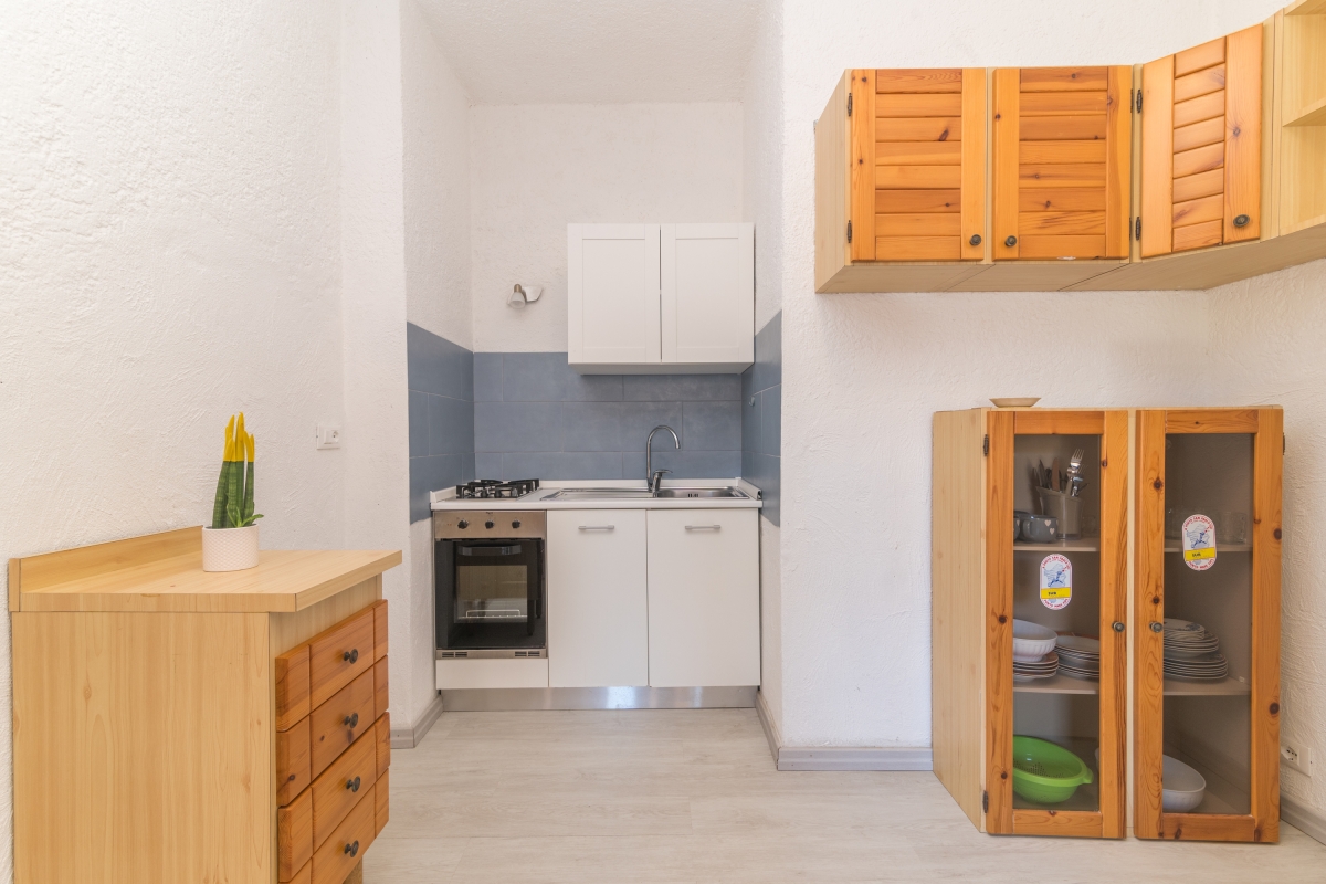 The property is arranged on the ground floor and enjoys a compact open-plan living space that incorporates a small kitchenette and is furnished with a flat-screen TV and a sofa bed. The kitchen is fully equipped with a Moka coffee machine, an oven, a cooker hob and a fridge freezer.