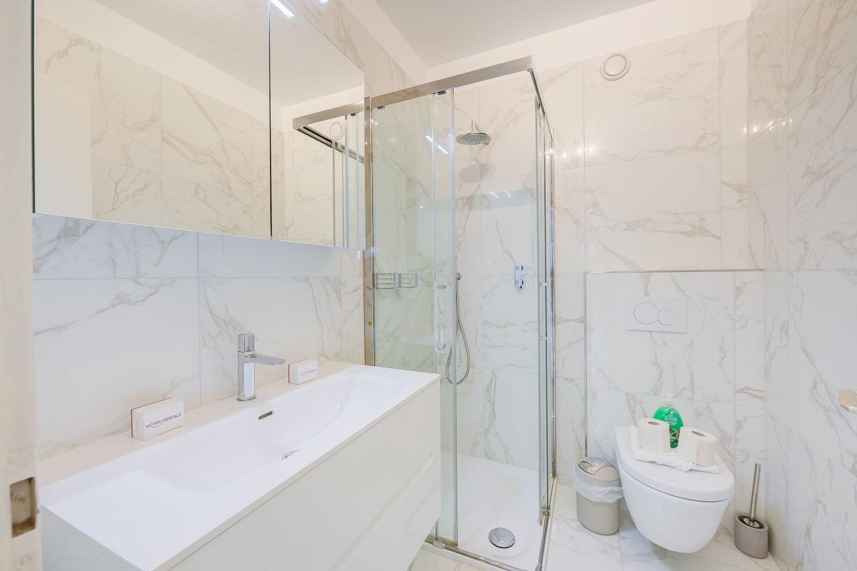 Bathroom 2: The modern and luminous marble bathroom has a shower, sink and WC.