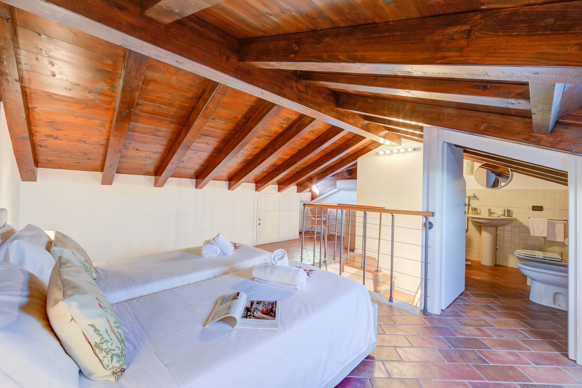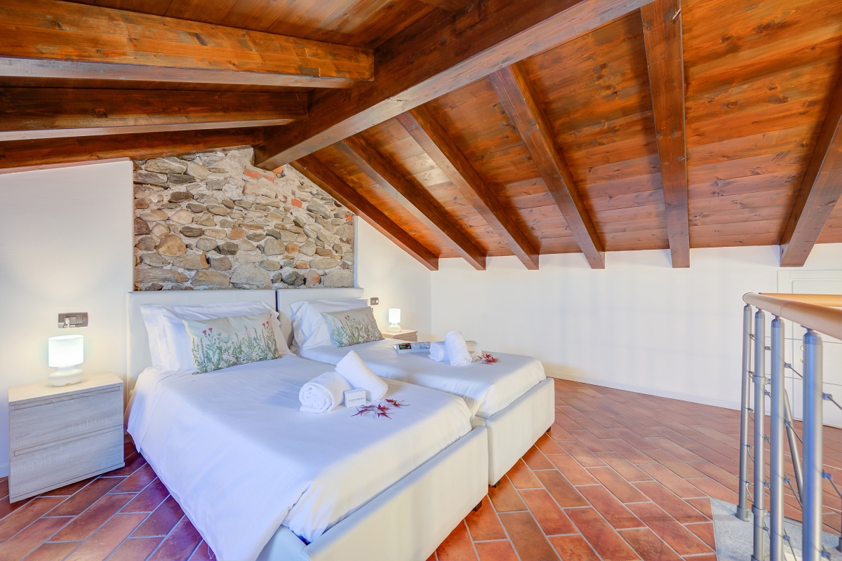 Bedroom 2: Upstairs, tucked under the wooden beams, this charming bedroom has 2 single beds, a wardrobe, a skylight with lake views and an en suite bathroom.