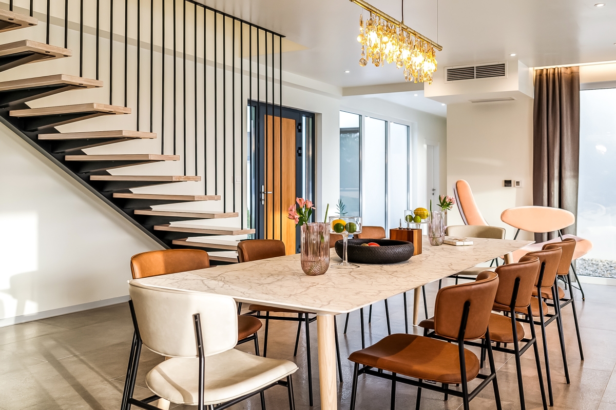 Inside the spacious, open-plan living area is stylishly furnished with a large L-shaped sofa, a flat-screen HD-TV, a Play Station 5, a dining table for eight and a high-specification kitchen, fully fitted with; an induction hob, oven, dishwasher, microwave, Nespresso coffee machine and a fridge freezer. There is also a small study.