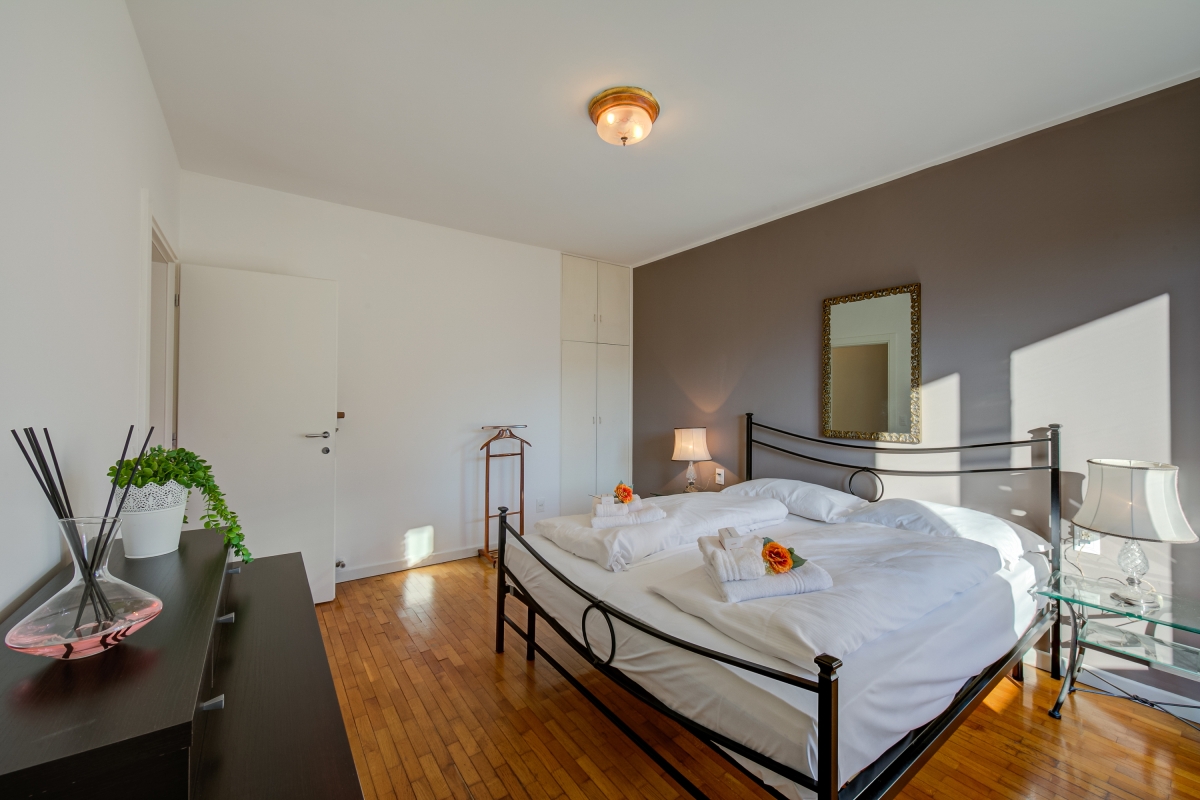 Bedroom 1: A light-filled, romantic master bedroom with direct terrace access, a double bed and a wardrobe.