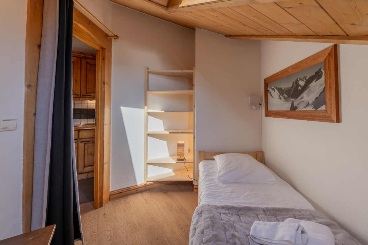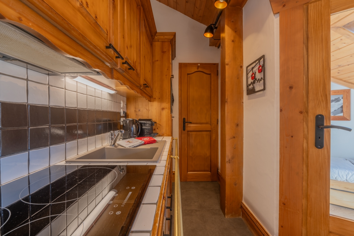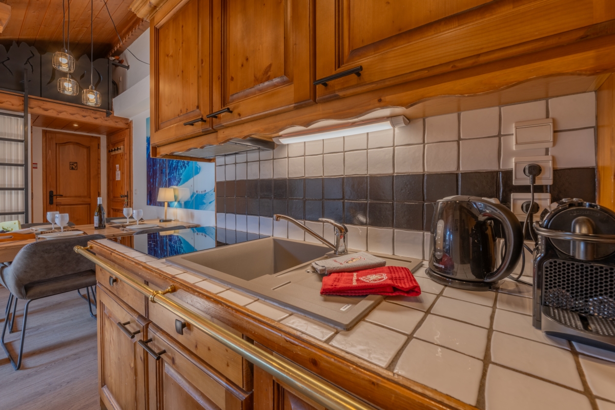 This stylishly decorated penthouse sleeps 4 people. The living area is lit by a large glass door that leads onto a private balcony, where there is a table and chairs, allowing guests to relax and enjoy the spectacular mountain views. Indoors, the sitting area, with a pitched wooden ceiling, has a comfortable sofa, coffee table, large flat-screen tv and chest of drawers. The neat dining table and chairs are next to the open-plan kitchenette, which is well-equipped with an induction hob, microwave, dishwasher, fridge, toaster.
