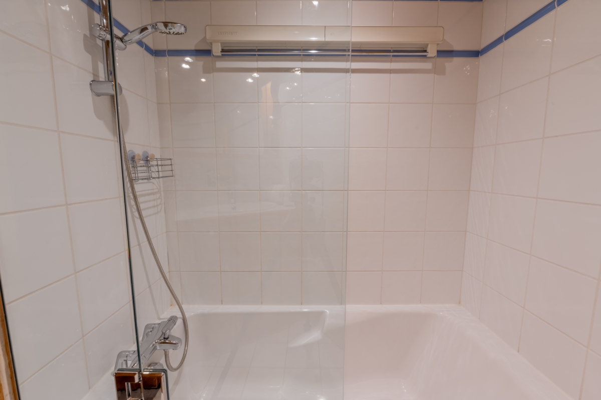 Bathroom 1: The freshly tiled, independent bathroom has a full bath with shower, basin and WC.