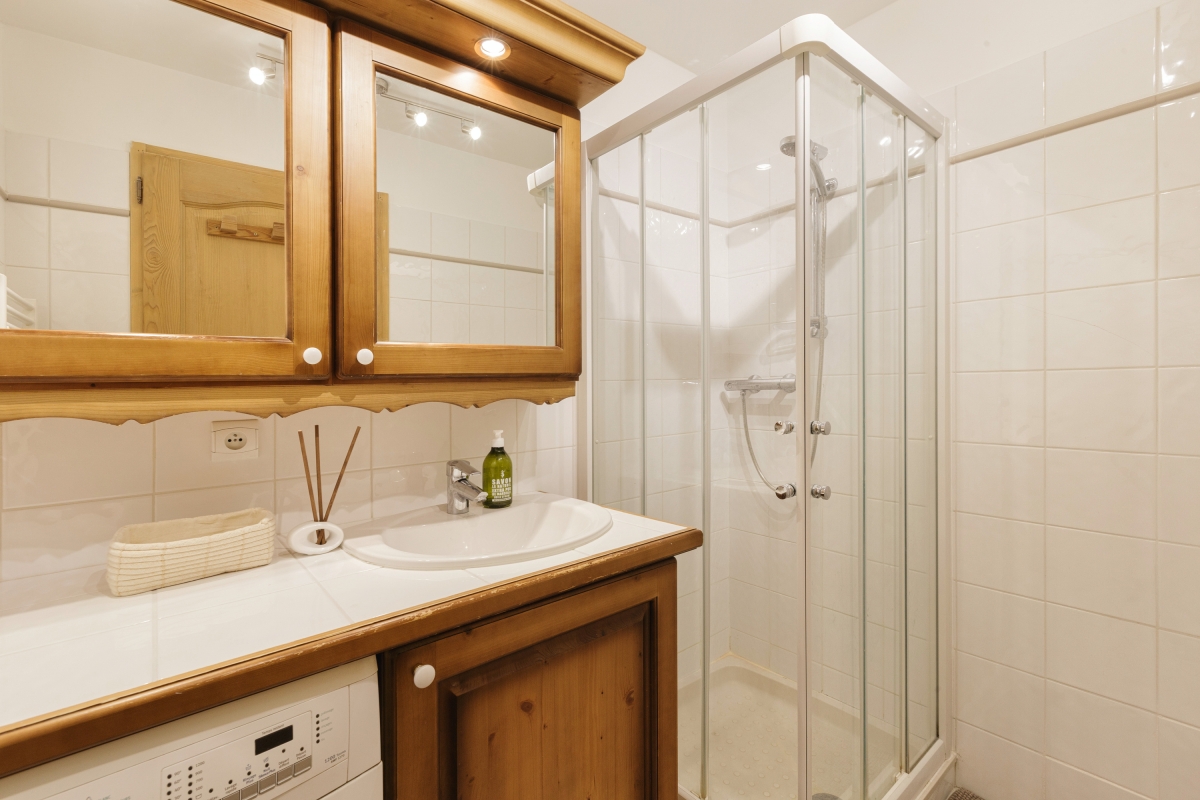 An independent bathroom, with a glass shower, washbasin, washing machine and W.C.