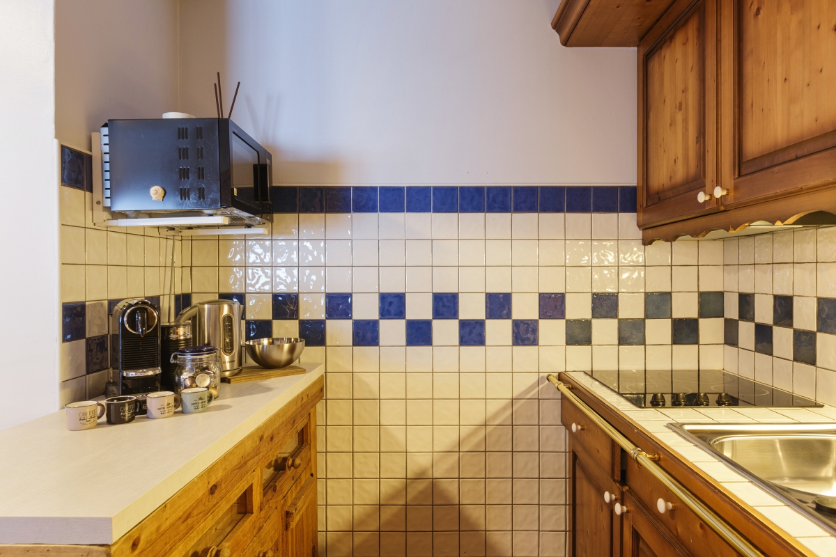 The apartment sleeps 5 people in comfort and has been thoughtfully and beautifully decorated throughout. The décor is contemporary but warm. The main living area has large windows with two glass doors leading out onto the private balcony, with chairs, where guests can relax and enjoy the view of the mountains. The living room has a sofa, coffee tables, wardrobe and flatscreen TV. Close by is the wooden dining table which seats 5 people. The kitchenette tucked away in the corner of the room, is well equipped with a cooker hob, oven, microwave, toaster and fridge/freezer.