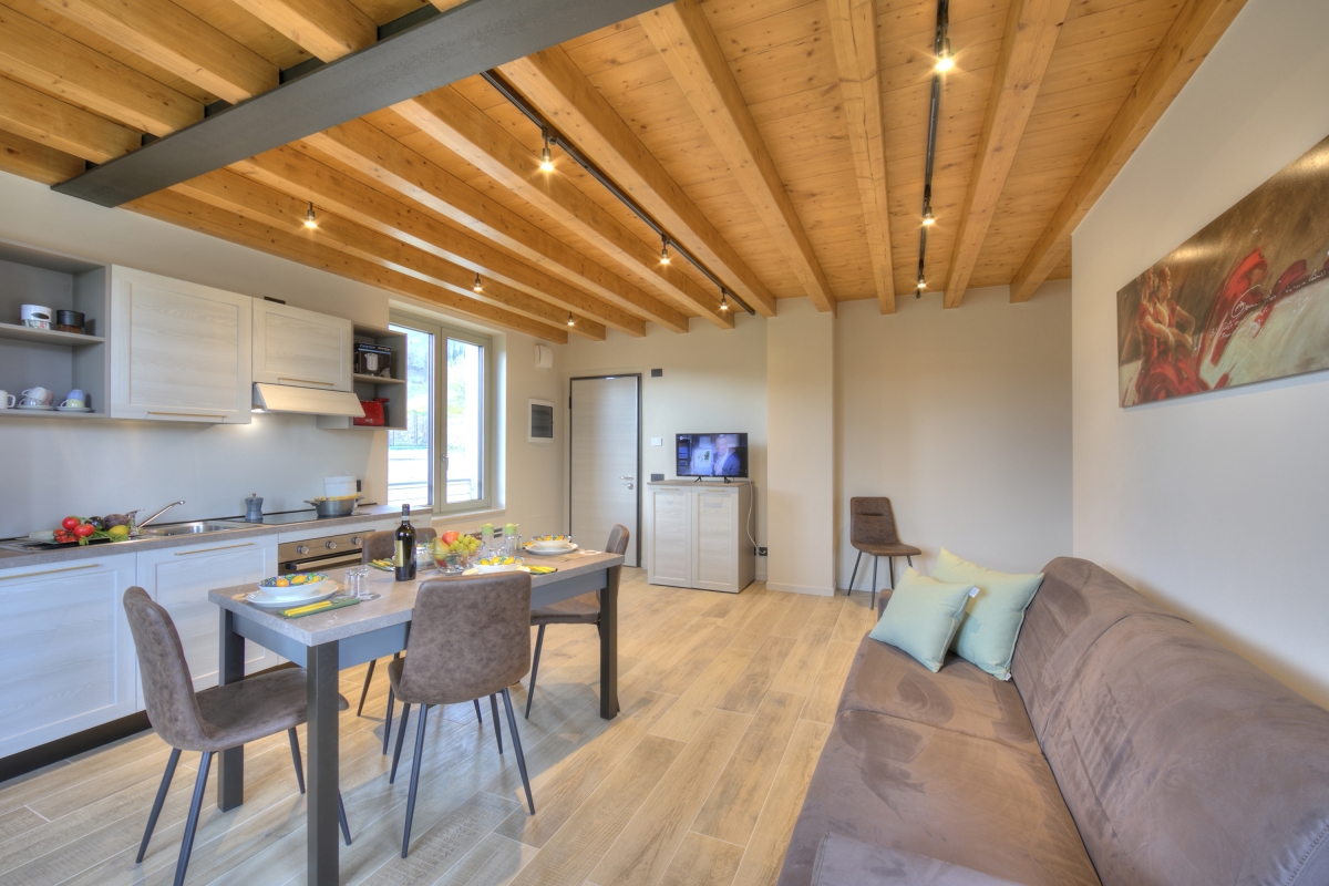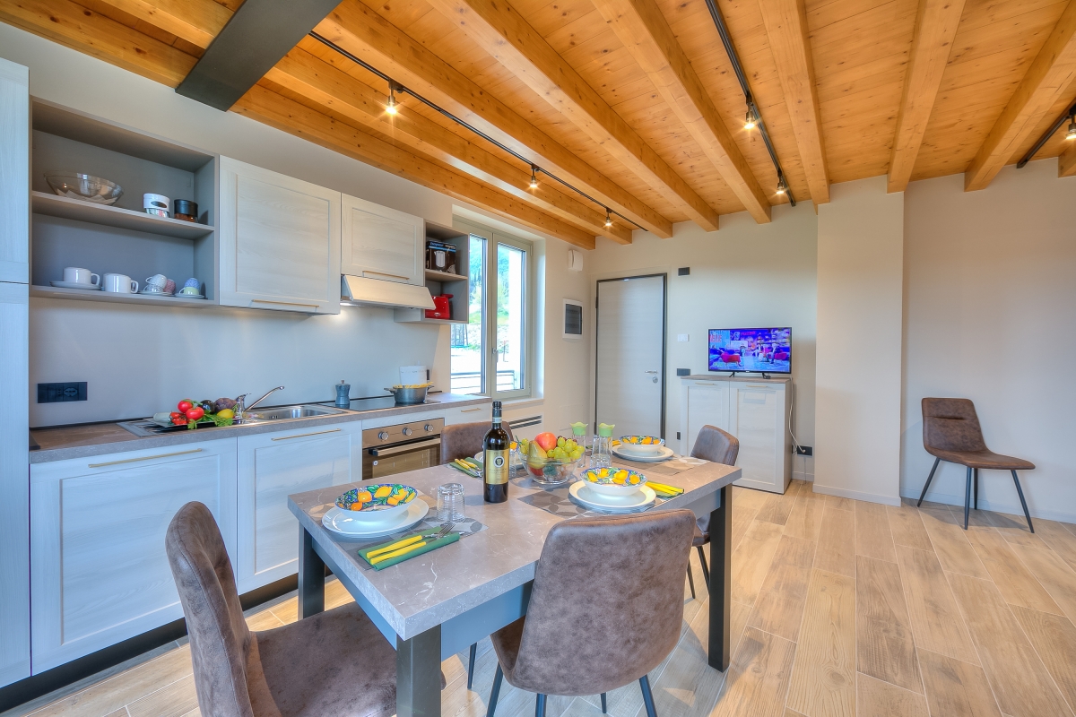 Inside, the apartment is stylishly furnished with a chalet-style, exposed wood ceiling and newly fitted wooden floor. The open-plan living space features a large comfortable sofa bed, dining table and six chairs, flat-screen smart TV and a kitchenette fully equipped with an induction hob, oven, dishwasher, coffee machine and fridge freezer.