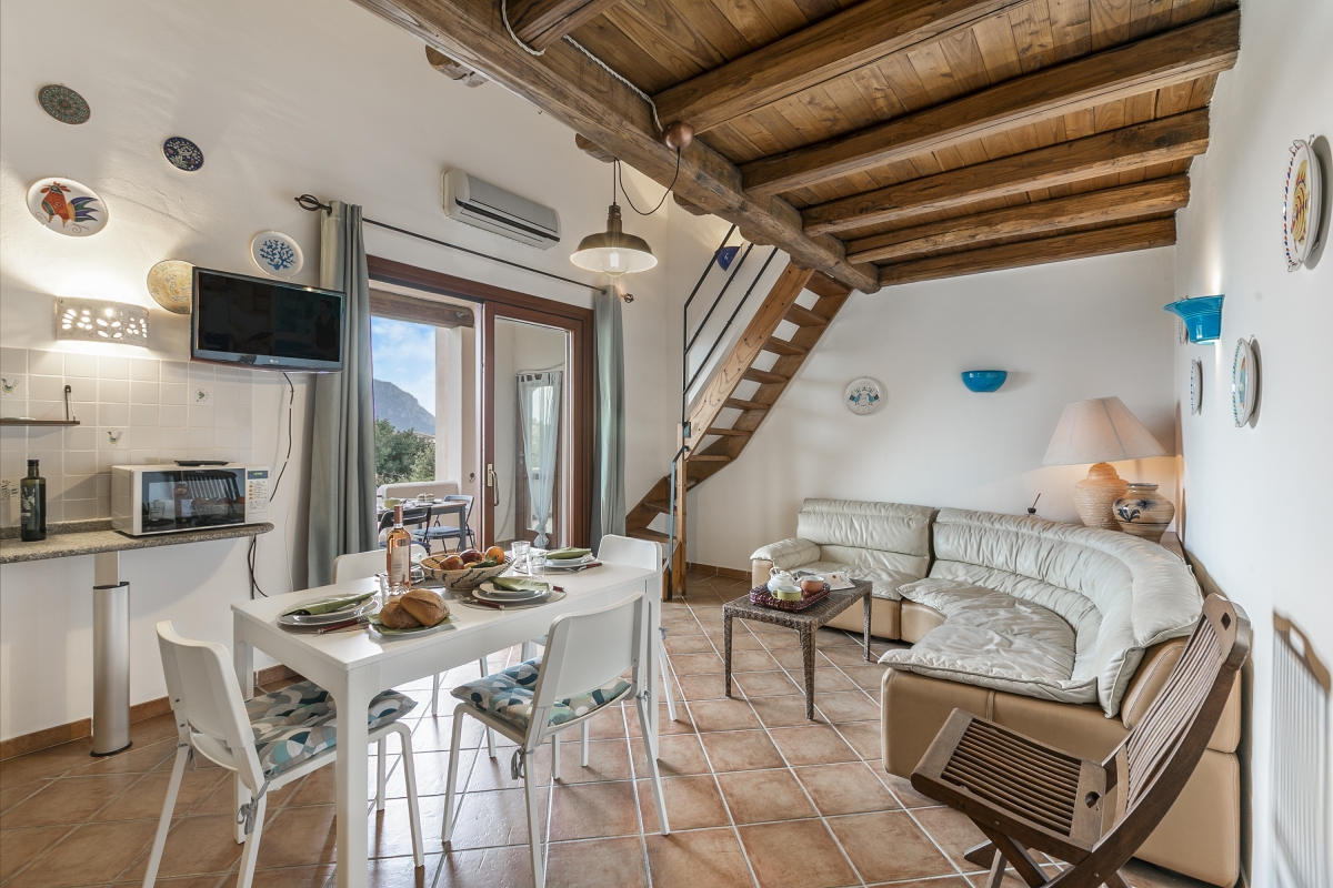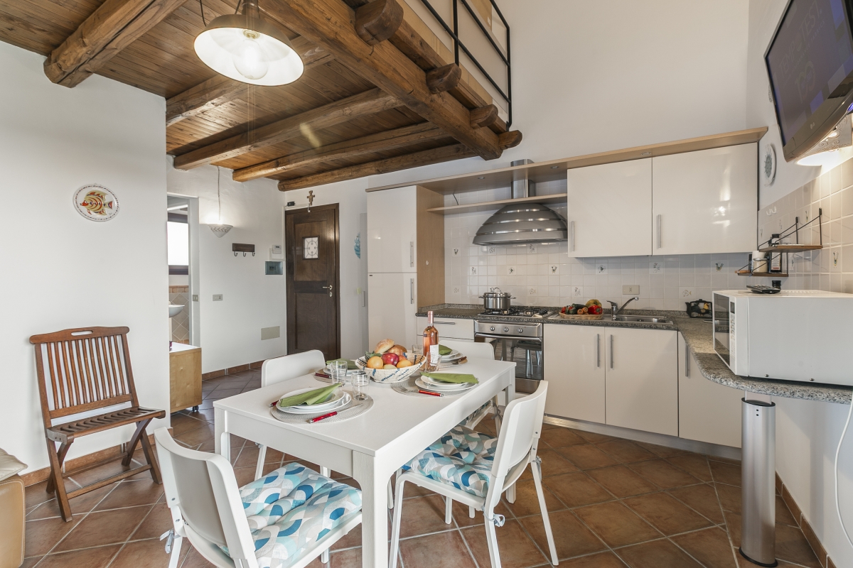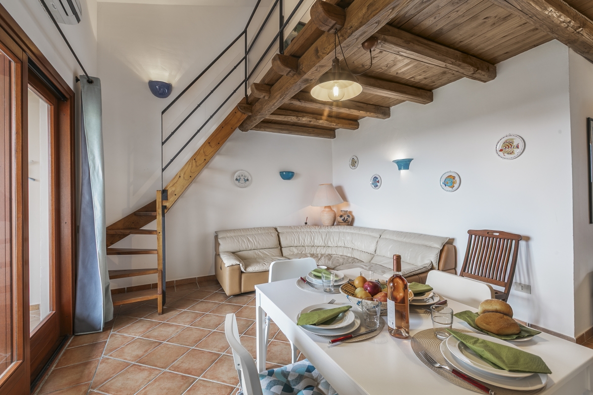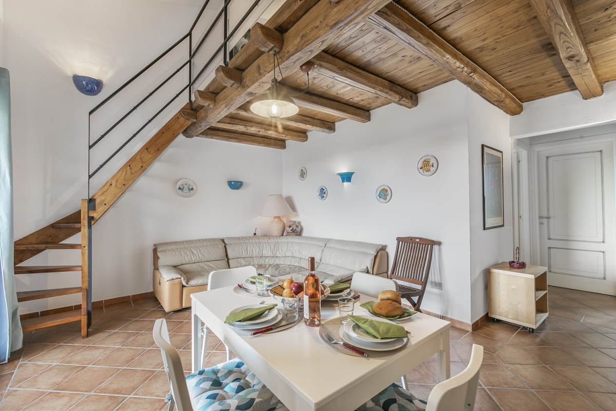 The apartment, located in the Residence Il Borgo, has all the features to allow a comfortable and relaxing stay. Located on the first floor it has a covered terrace with sea view and table and chairs and inside it consists on the entrance floor of a living room with open kitchen, a double bedroom with double bed and a bathroom, in the loft open to the living room a bedroom with two single beds and a bathroom.
