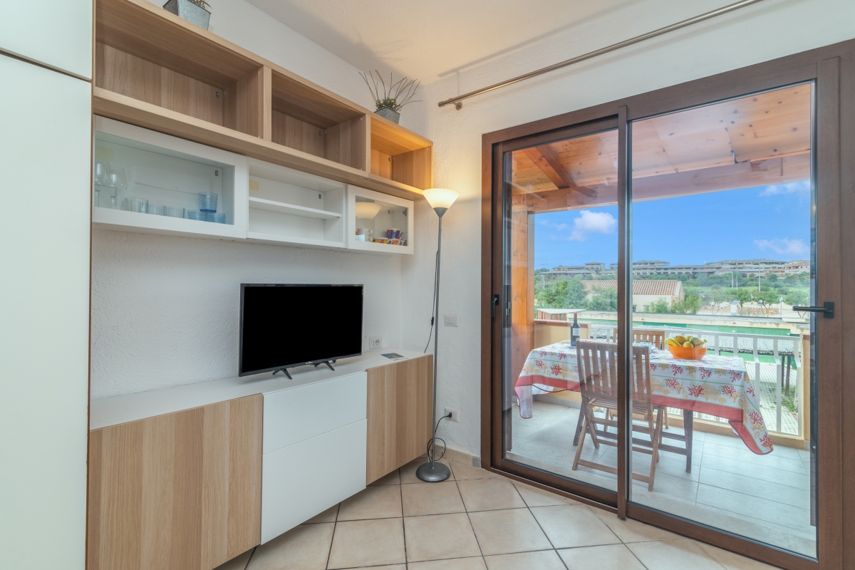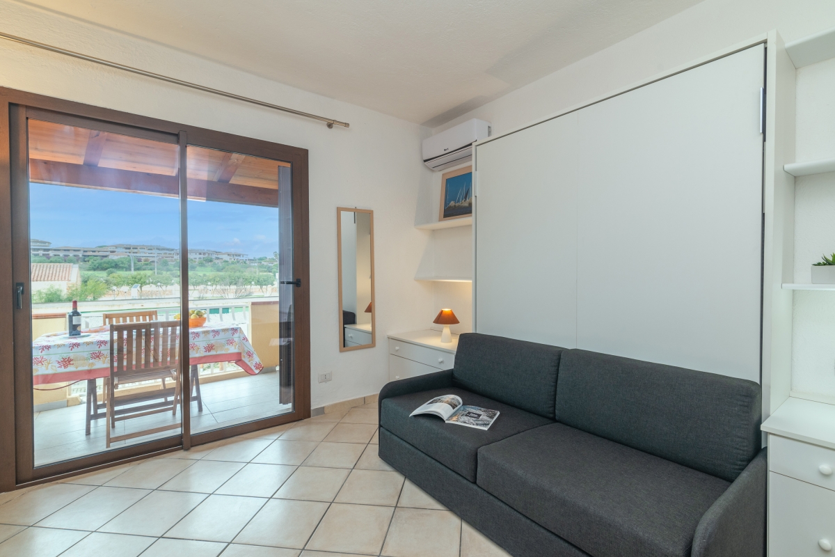 Inside, the open-plan, air-conditioned living room overlooks the terrace and is furnished with a comfortable fold-out double bed, a dining table, a storage unit, and a TV. The kitchenette is equipped with a stove, microwave, refrigerator/freezer, and dishwasher.