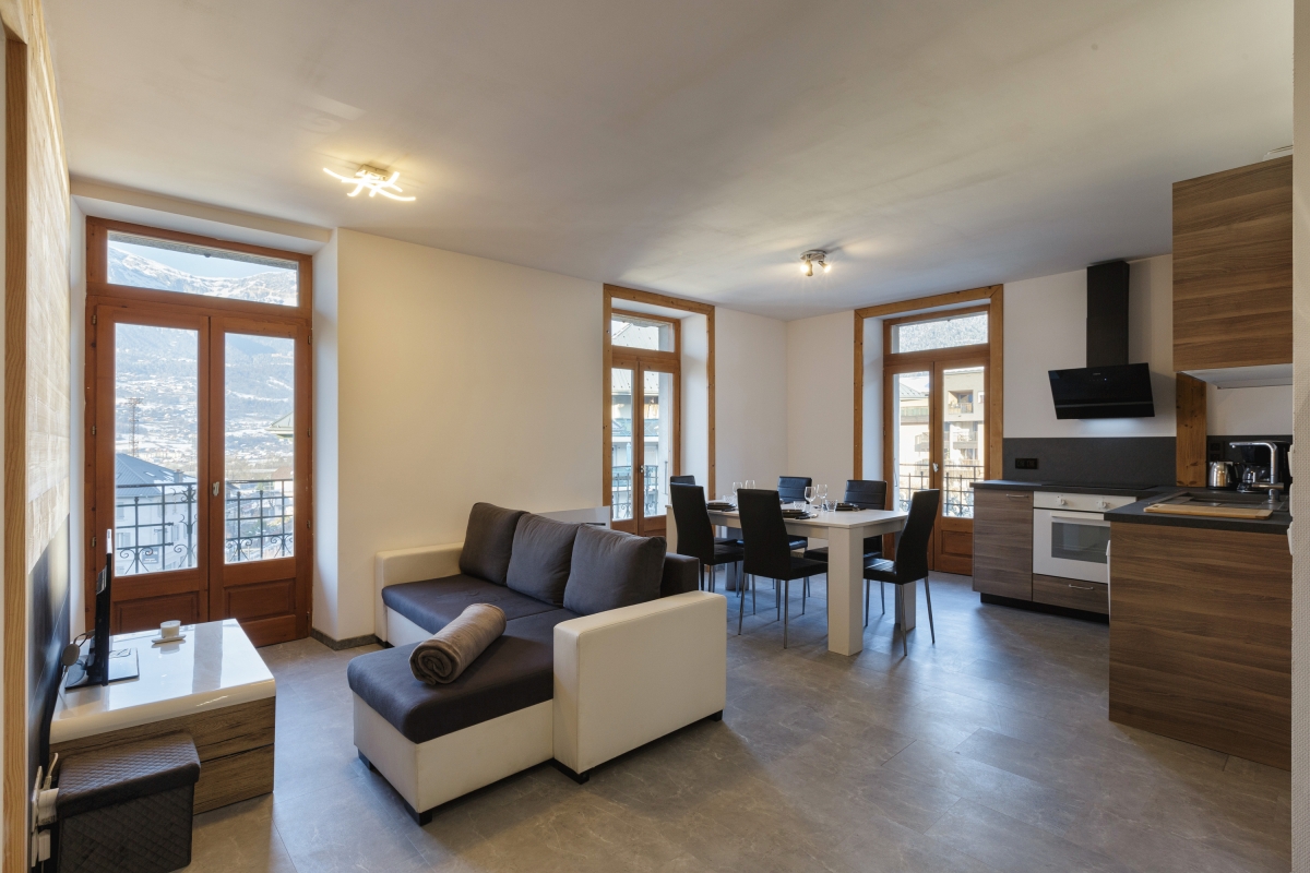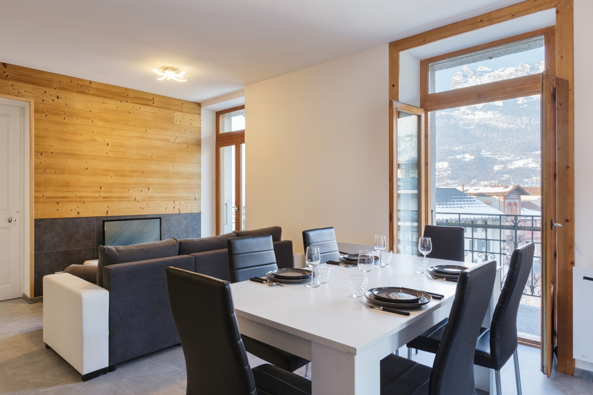 With wonderful panoramic mountain views and stylish interiors, this 2-bedroom balcony apartment offers the perfect ski holiday base for couples, groups and families of 5. Inside, the bright, 3-floor apartment benefits from free WiFi access and a wall-mounted Smart TV. The uplifting open-plan living room is equipped with a comfy convertible sofa and a stylish kitchen diner for 5. A dishwasher, oven, microwave, fridge and drip coffee machine are available for a carefree, self-catering stay. There is direct access to a mountain-view balcony where you can unwind in privacy after a day of skiing.