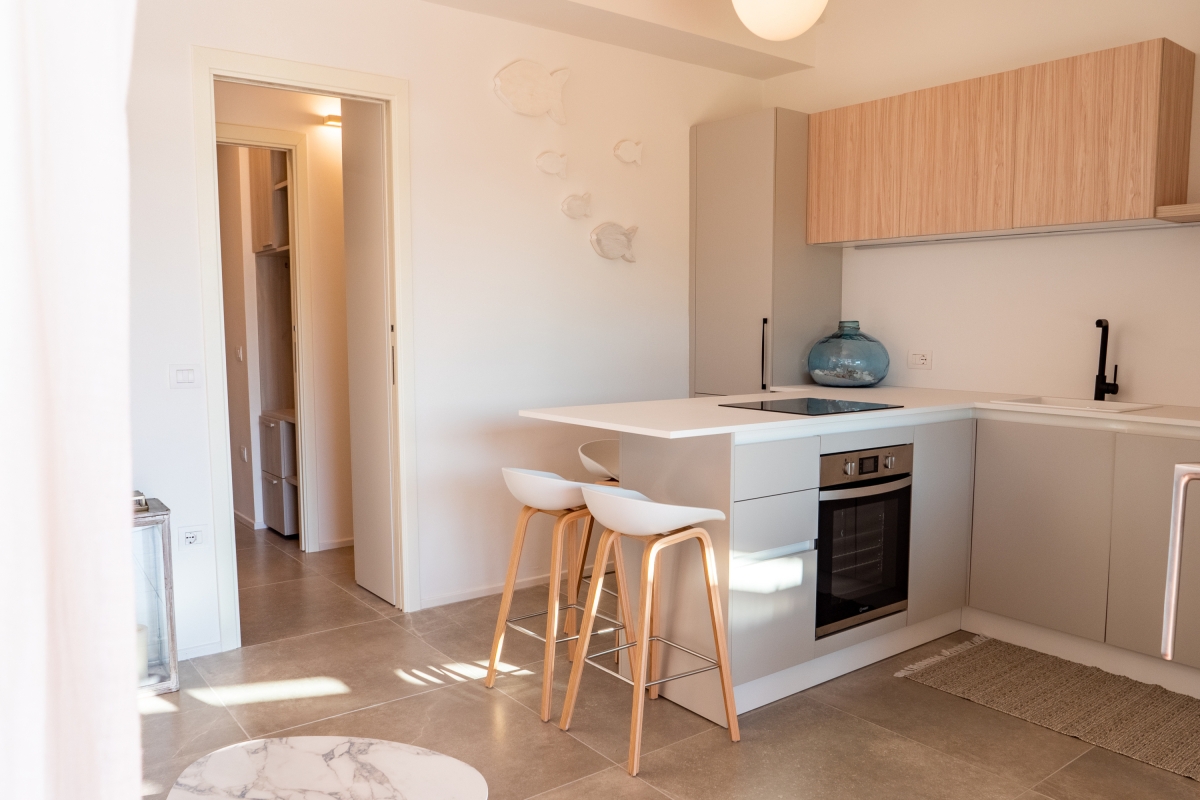Inside the modern, open-plan living space incorporates a dining room, kitchen and soft seating area with a sofa and large, glass doors that lead directly onto the veranda. The kitchen is fitted with a breakfast bar and four stools and is fully equipped with an induction hob, oven, fridge-freezer, dishwasher, and coffee machine.