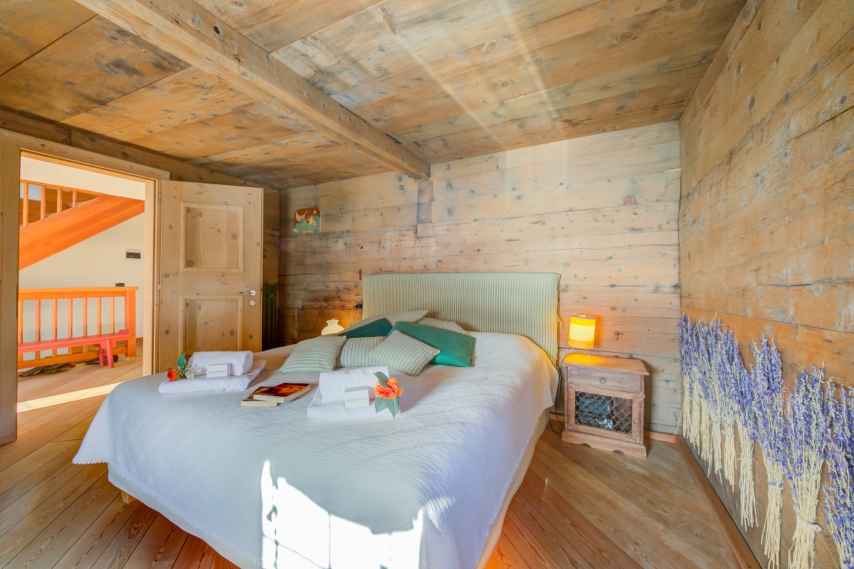 Bedroom 1: A cosy, wood-panelled balcony bedroom with a double bed and a wardrobe.