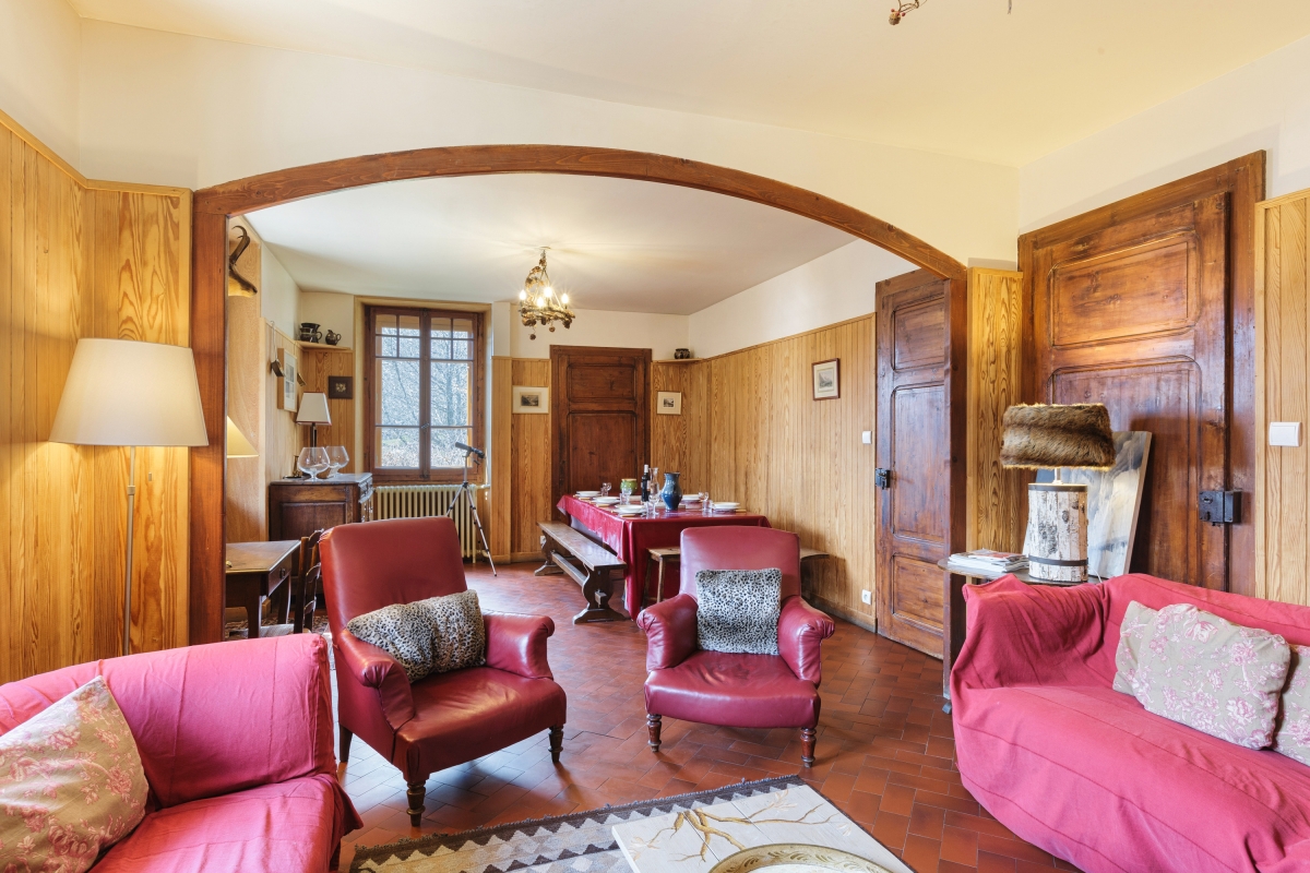 The spacious open-plan living and dining room opens onto the terrace and is furnished with two large sofas, several armchairs and a large dining table. There is also a cosy TV room on the ground floor with a piano. The separate kitchen is well-equipped with a cooker hob, an oven, a raclette, a microwave, a drip coffee machine, a dishwasher and a fridge freezer.