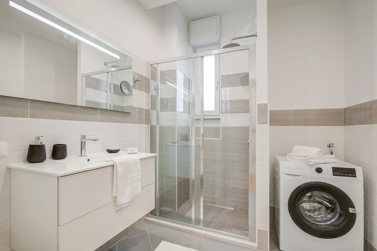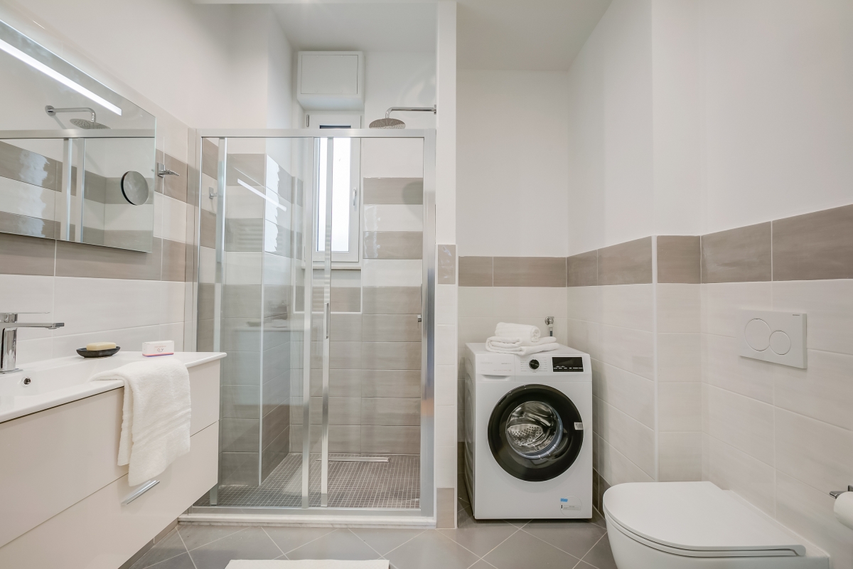 The bathroom of the apartment is equipped with a shower, toilet and bidet.