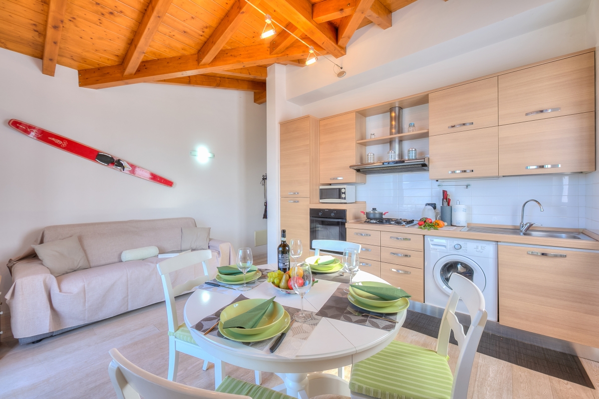 The spacious open-plan living area is furnished with a small dining table and four chairs, a comfortable double sofa bed and a flat-screen HDTV. Large, floor-to-ceiling glass doors open onto the terrace creating a wonderful alfresco extension and the perfect spot to relax at any time of the day. The well-equipped kitchen is fitted with a microwave, cooker hob, oven, fridge freezer and a coffee machine.
