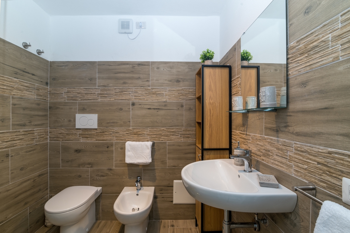 Bathroom 1: A large, fully equipped tiled bathroom with a separate shower, bidet, sink and toilet.