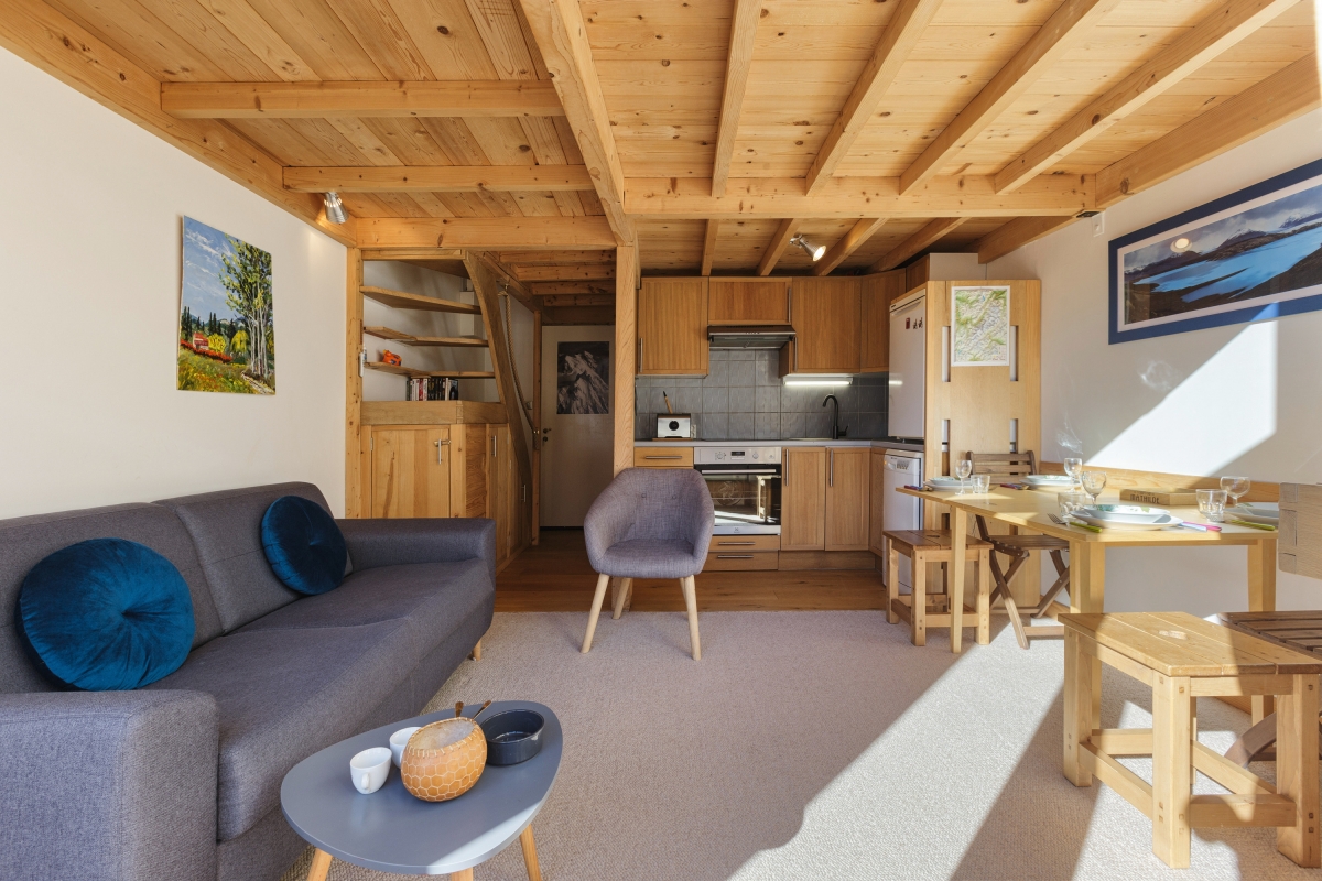 The 2-bedroom holiday apartment is a stylish, peaceful and convenient base, with wood interiors to give you a taste of alpine living. The splendid, open-plan living room has a big sofa, with a coffee table and a flat-screen HDTV in front to kick back and relax, along with direct access to a private balcony with open-air seating. This is further completed by a modern kitchen to take care of your every need on a self-catering holiday. Utilities include a microwave, mokka coffee machine, toaster, oven and fridge.
