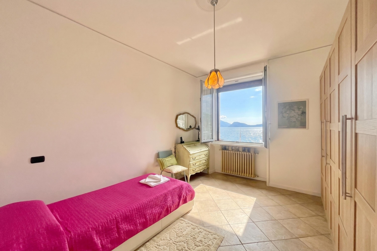 Bedroom 2: A bright lake-view bedroom with a single bed and wardrobe.