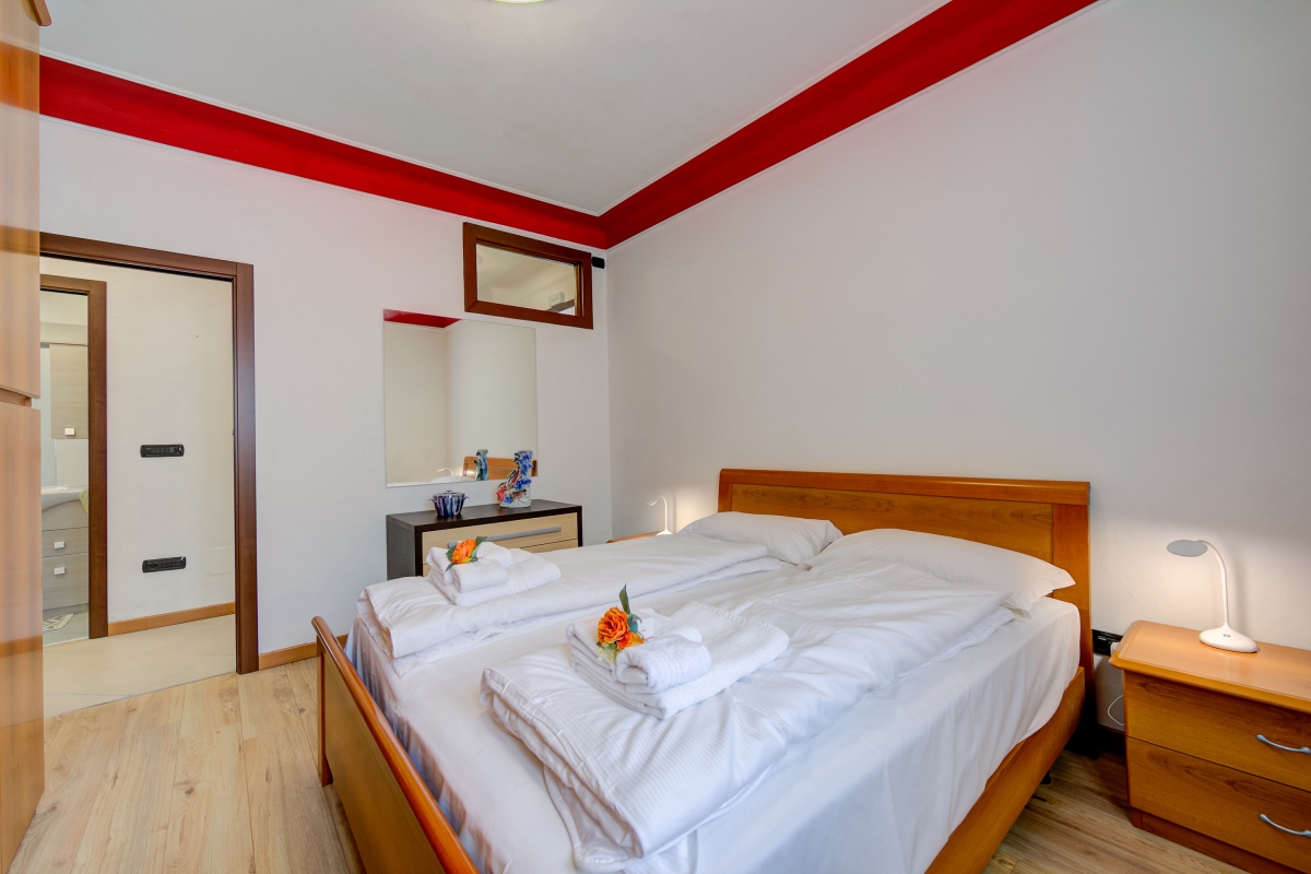Bedroom 1: A modern and bright master bedroom with a double bed and a wardrobe.